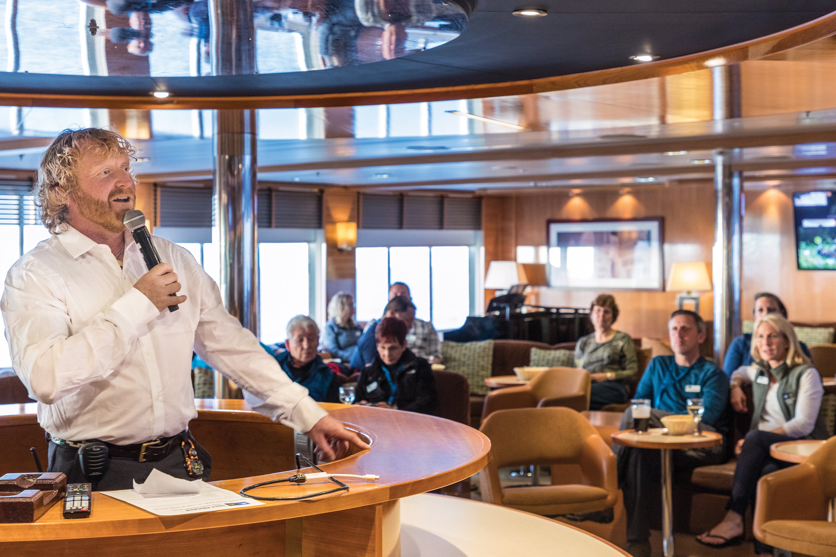 In most cases, the guest speaker will join the full expedition, sharing meals, venturing out to explore, and participating in every aspect of the journey. Sometimes, when the guest speaker is actively involved in world affairs—an acting ambassador or scientist in the middle of complex fieldwork—they will come aboard simply to share a day or lead a talk and then answer questions at the day’s end.