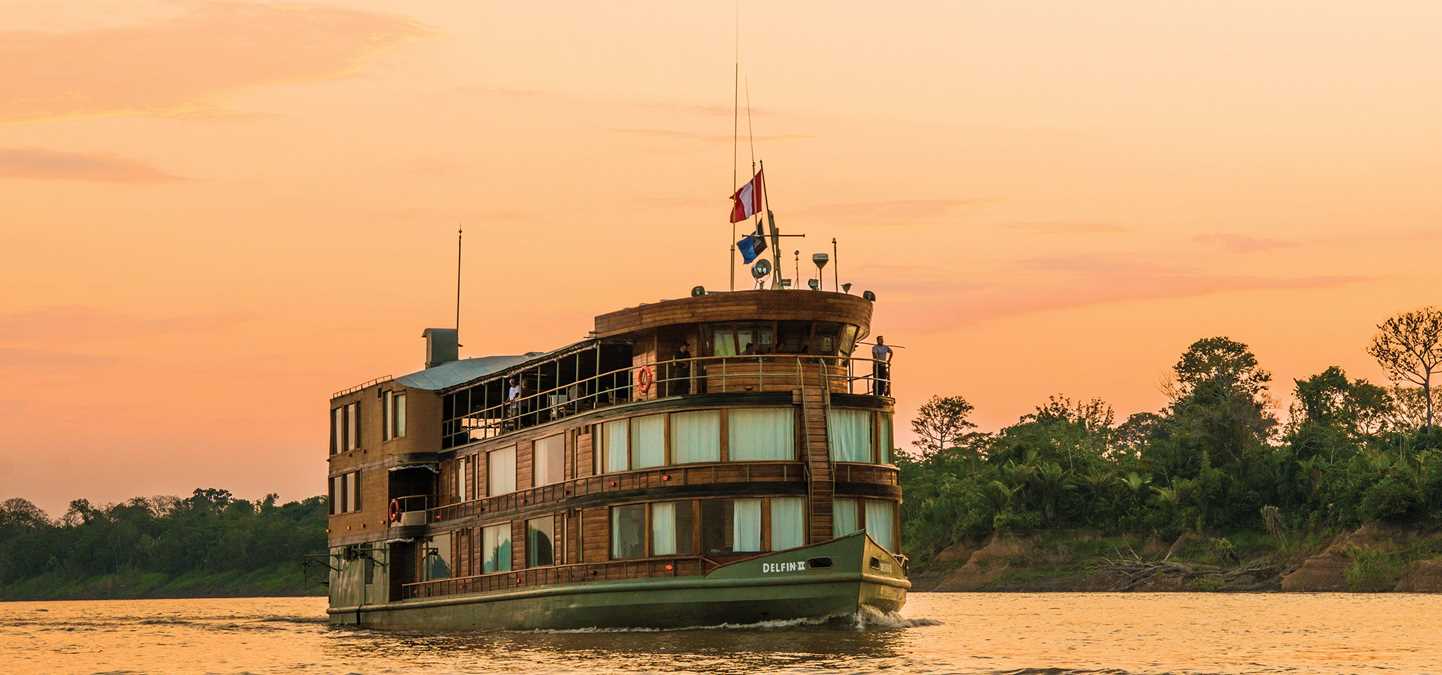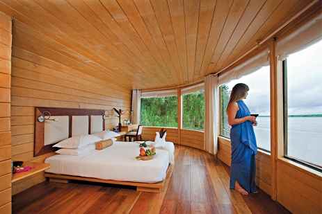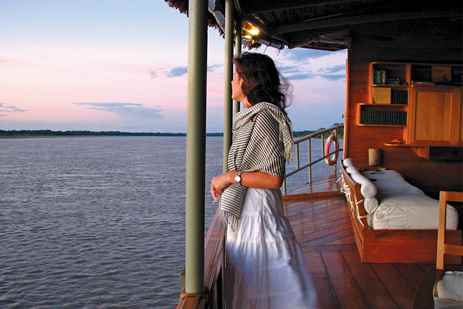 As much of the river as on it and locally built, Delfin II’s iron exterior is clad in tropical hardwoods and her interior gleams with wood floors and lacquered palm ceilings. Wood stairs float between decks and lazily turning ceiling fans add the right tropical notes, while the air-conditioning invisibly cools and dehumidifies.