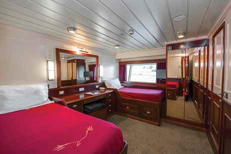 All cabins are tasteful, comfortable, and amply sized, with outside views. Most cabins have picture windows (two have two large portholes high in the cabin). Facilities include a private bathroom with shower, individually controlled air-conditioning and heating, television, music system, hair dryer, telephone, safety deposit box, bathrobes, and toiletries.