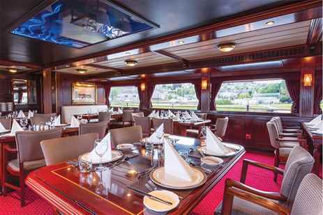 With exterior teak decks, hardwood finished interiors, and fine fabrics, Lord of the Glens offers a stylish and relaxing ambience. The two lounges and two open-air viewing areas are social hubs aboard ship. There is a bar, and space to read books from the library.