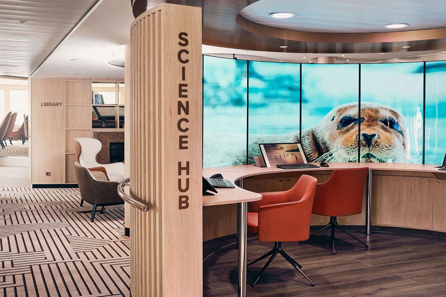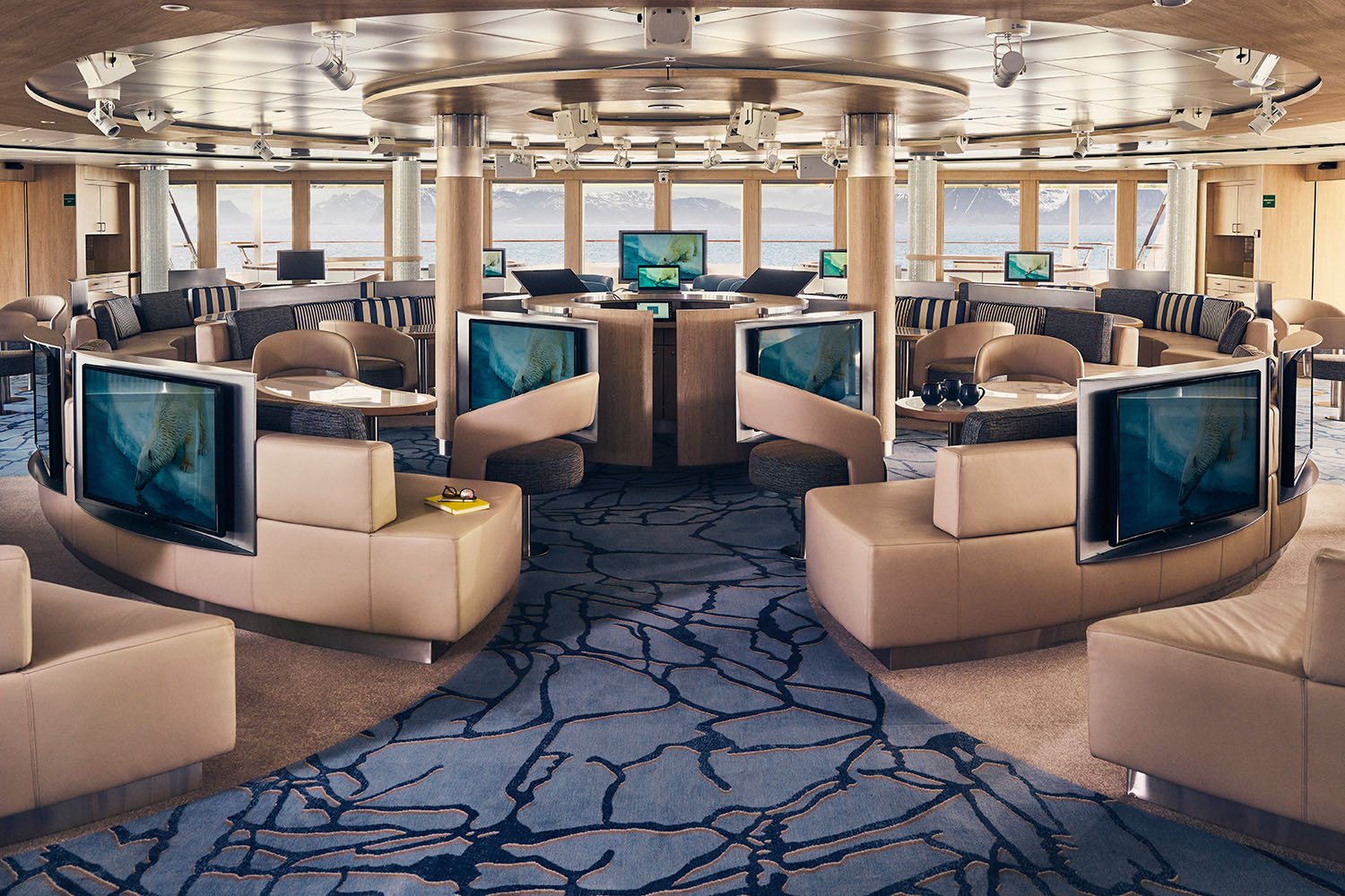 The Lounge Deck’s Ice Lounge, with its signature Lindblad Circle of Truth at the center, is where the daily ritual of Recap—convening, sharing knowledge, and anticipating tomorrow—takes place over cocktails and canapes, with engaging presentations or undersea videos lighting the screens.