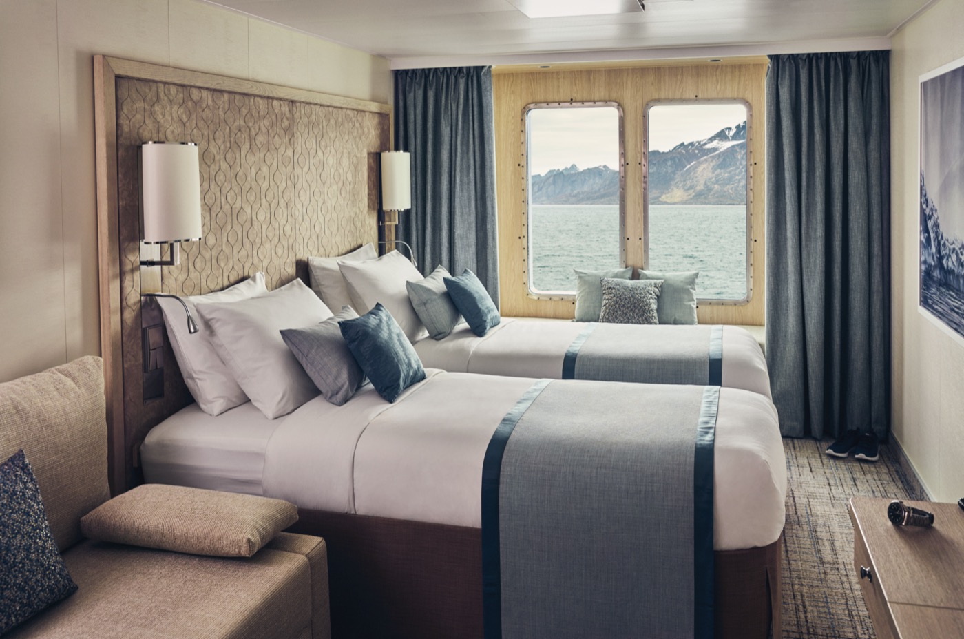 Category 1 cabins, located on the Fore Deck, can be configured with two single beds or one double bed. They feature an armchair, writing desk and chair, two bedside tables, window alcove seating, and a closet with ample storage.