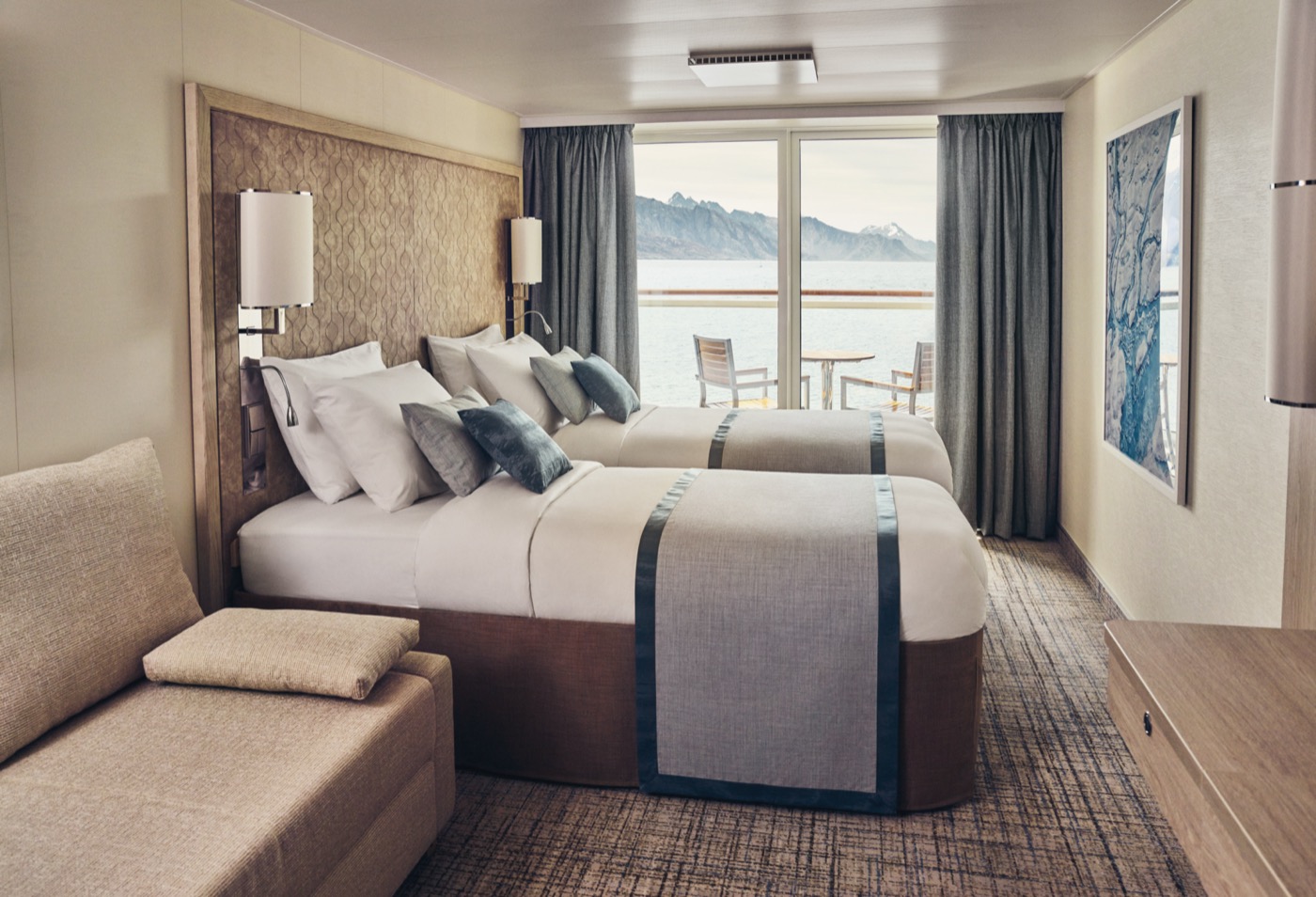 Categories 3 and 4 cabins, located on the Main and Lounge Decks, can be configured with two single beds or one double bed. They feature a balcony outfitted with two chairs, a table, and a hammock; convertible sleeper sofa; writing desk and chair; two bedside tables; and a closet with ample storage.