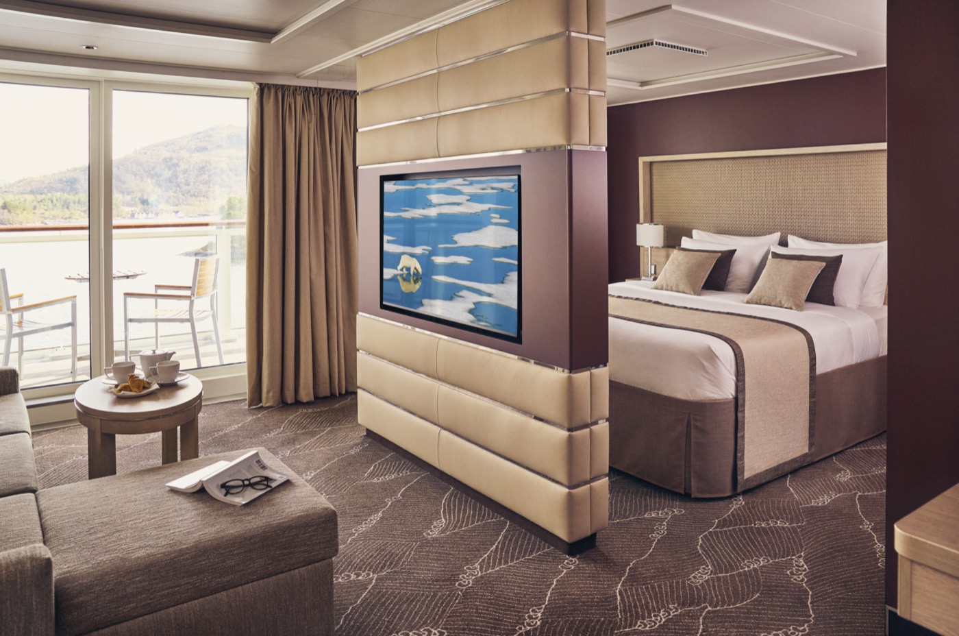 The Category 6 junior suite, located on the Bridge Deck, can be configured with two single beds or one double bed. The balcony, which extends the full length of the cabin, is outfitted with two chairs, a table, and a hammock. The spacious junior suite features a slender privacy wall with TVs on either side, a separate vanity area, convertible sleeper sofa, writing desk and chair, two bedside tables, and a closet with ample storage.
