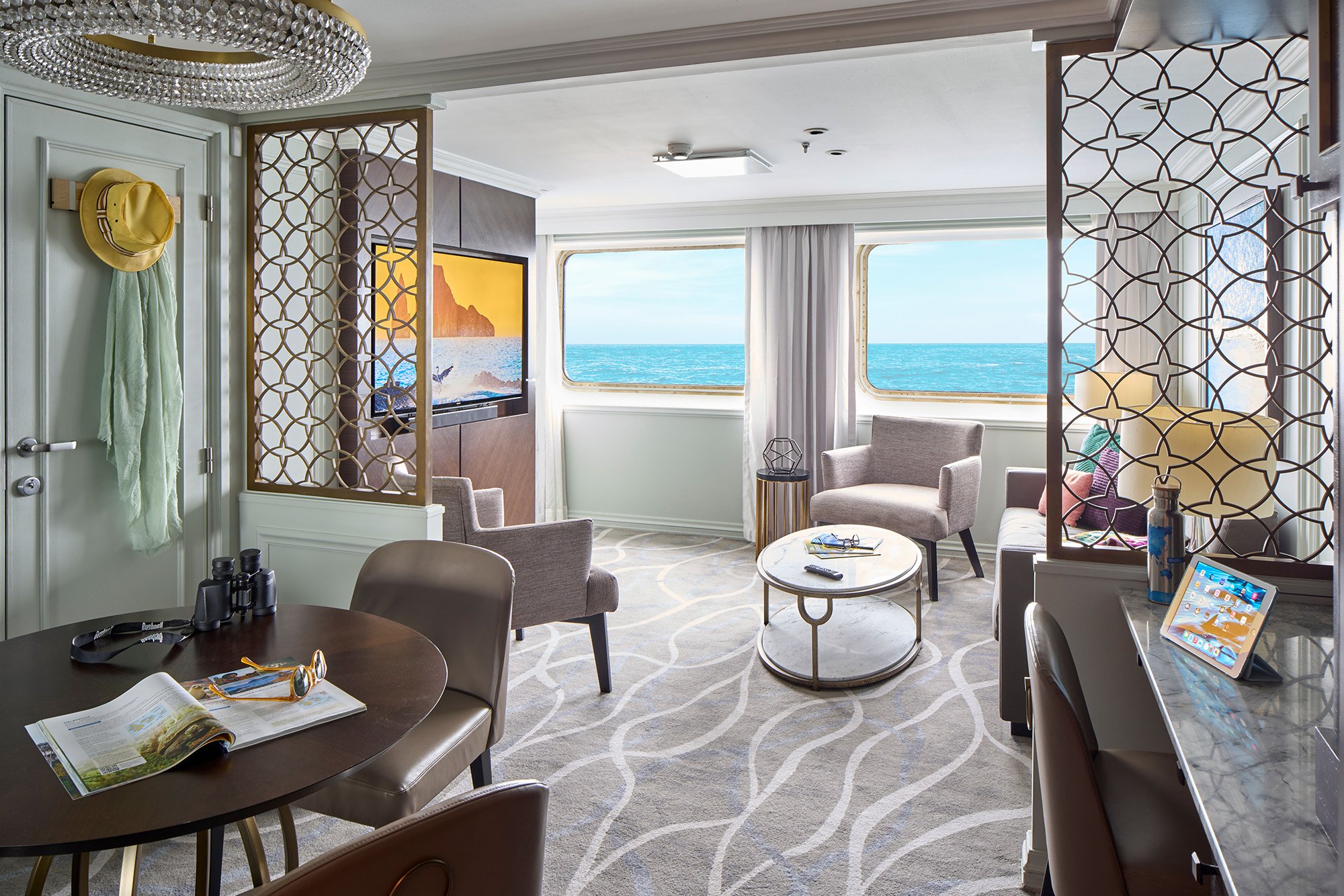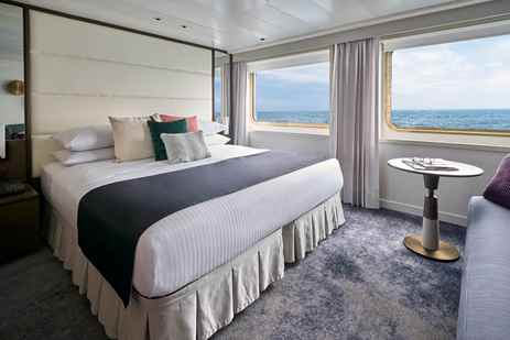 18 Suites, 4 Solo suites, and 4 Islander Suites accommodating just 48 guests—all with large windows, convertible king/twin beds with 600-thread count bedding, ample closets, sofa, and marble double-sink bathrooms with a collection of organic amenities crafted exclusively for Lindblad Expeditions. In addition, a stocked mini-bar can be customized to guests’ preferences, and there’s in-room coffee and tea, Wi-Fi, and a flat-screen TV.