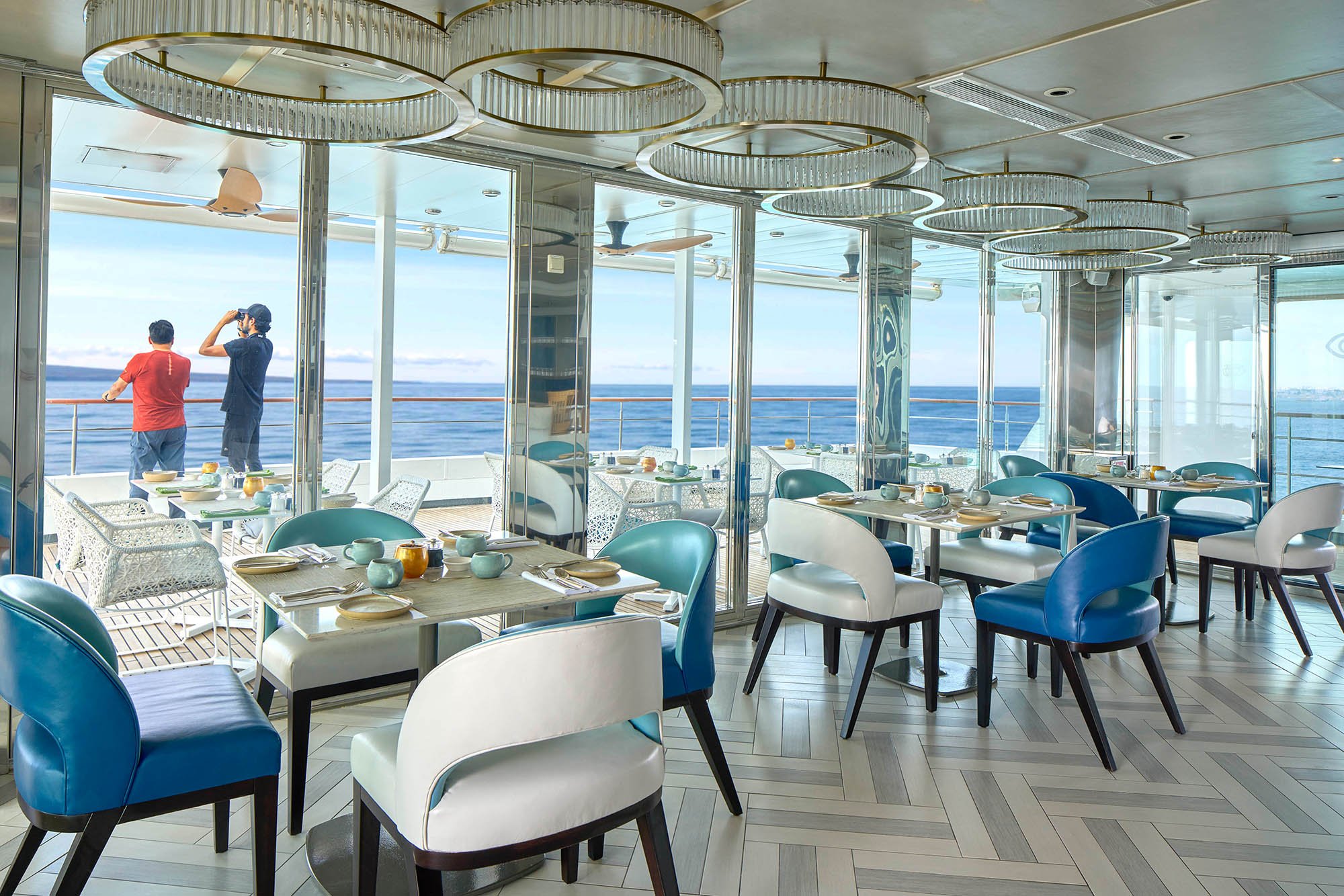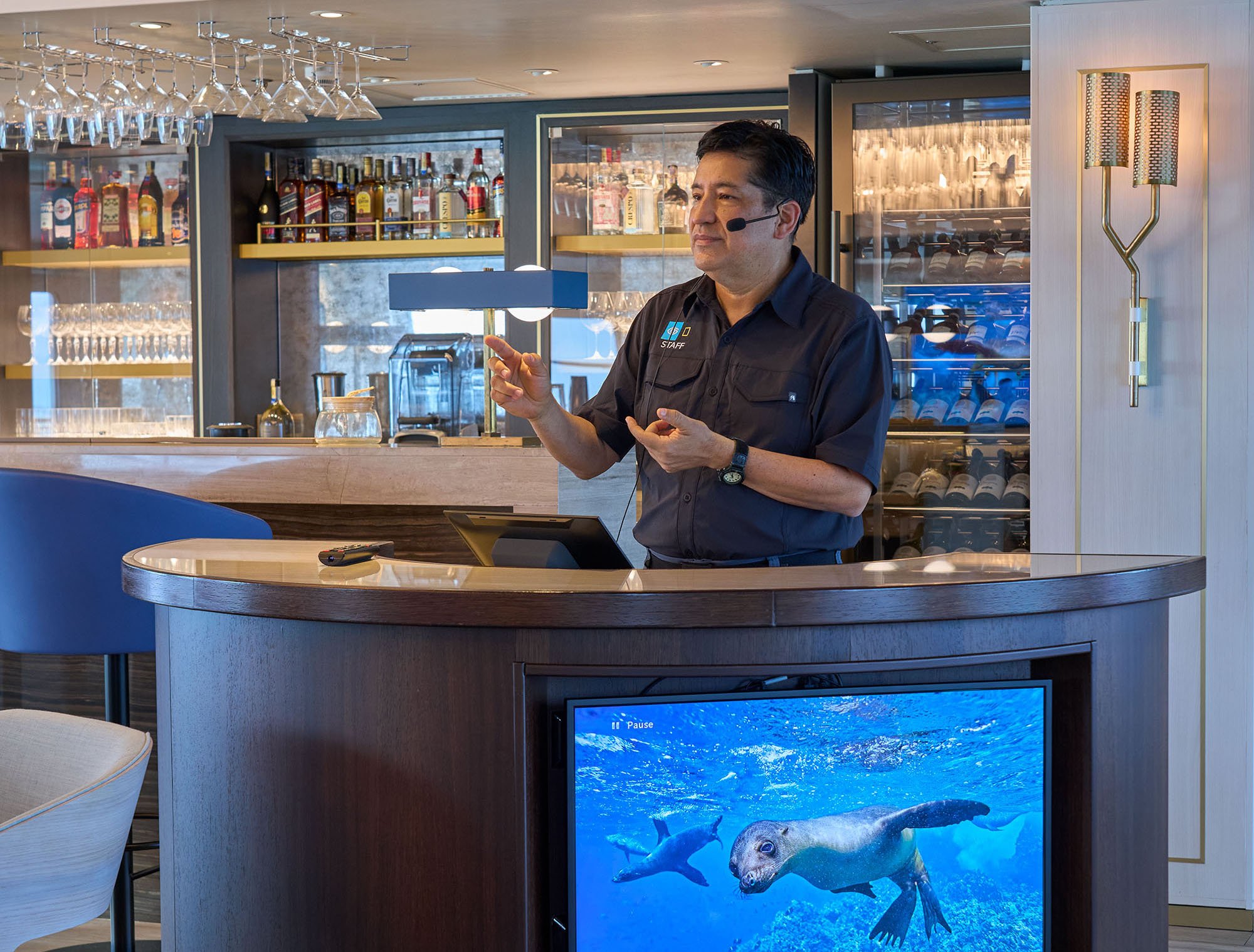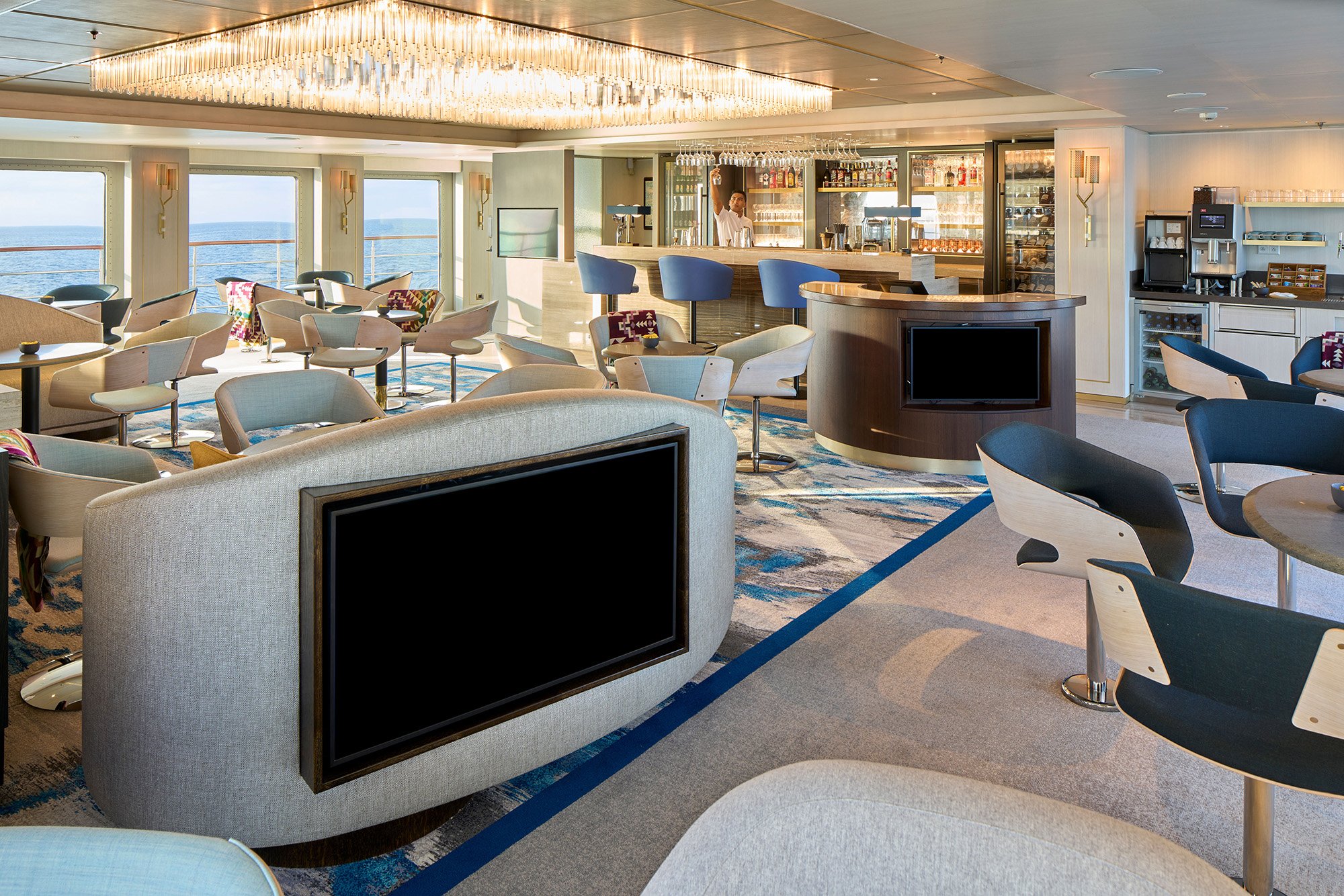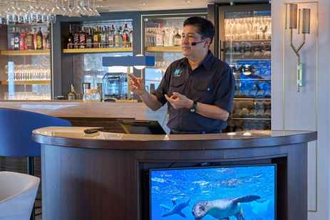 The newly reimagined Cove is a gathering spot for pre-dinner Recaps, camaraderie with like-minded travelers, and craft cocktails. Four flat-screen TVs are part of a state-of-the-art communications system for engaging and informative audiovisual presentations. A forward-facing viewing platform invites you to step outside to take in the beauty of the islands.