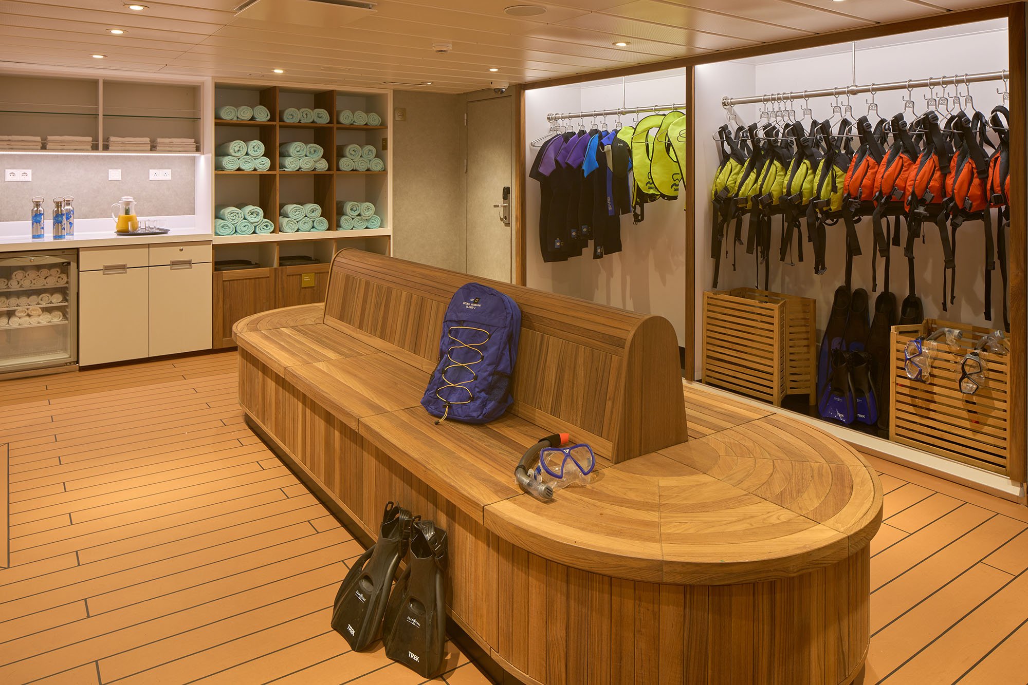 The newly refitted teak-appointed marina is spacious and climate-controlled, designed for guests to comfortably get in and out of expedition gear.