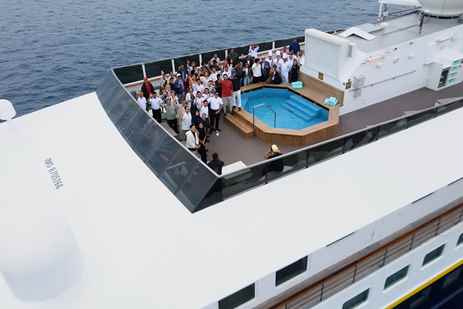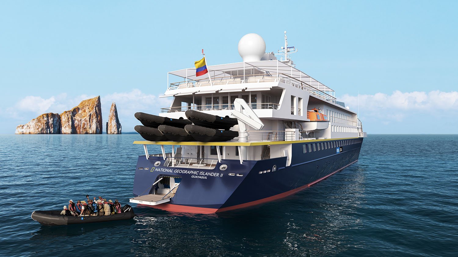 On October 23, 2022, Lindblad Expeditions christened National Geographic Islander ll off the island of Santa Cruz in Galápagos with local dignitaries, company leaders and media surrounding the bow in zodiacs.