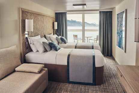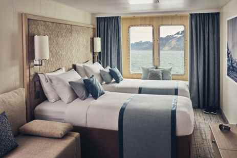 Category 1 cabins, located on the Fore Deck, can be configured with two single beds or one double bed. They feature an armchair, writing desk and chair, two bedside tables, window alcove seating, and a closet with ample storage.