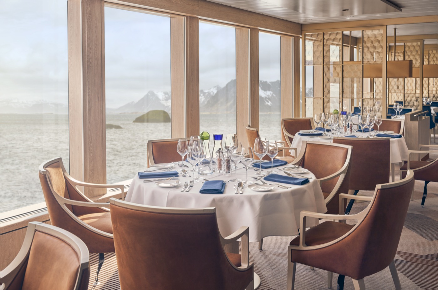 Restaurant 270º on the Main Deck features wrap-around views and provides a window on vital expedition team members: our galley staff as they prepare your meals. This dining area—like all others aboard our ships—features sustainable choices, local where possible, and unassigned, flexible, inclusive seating.