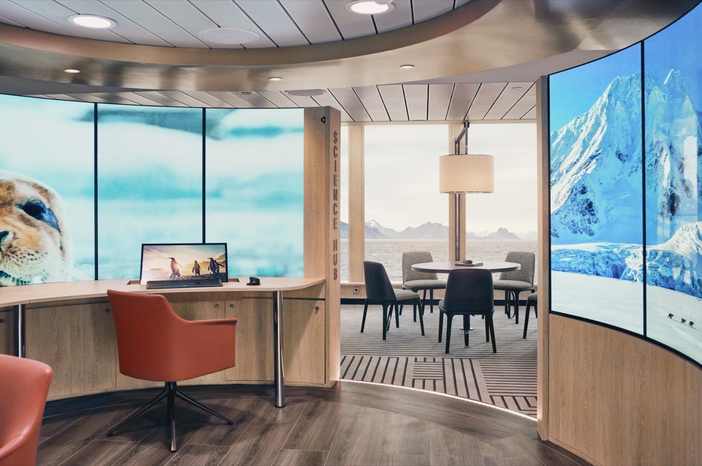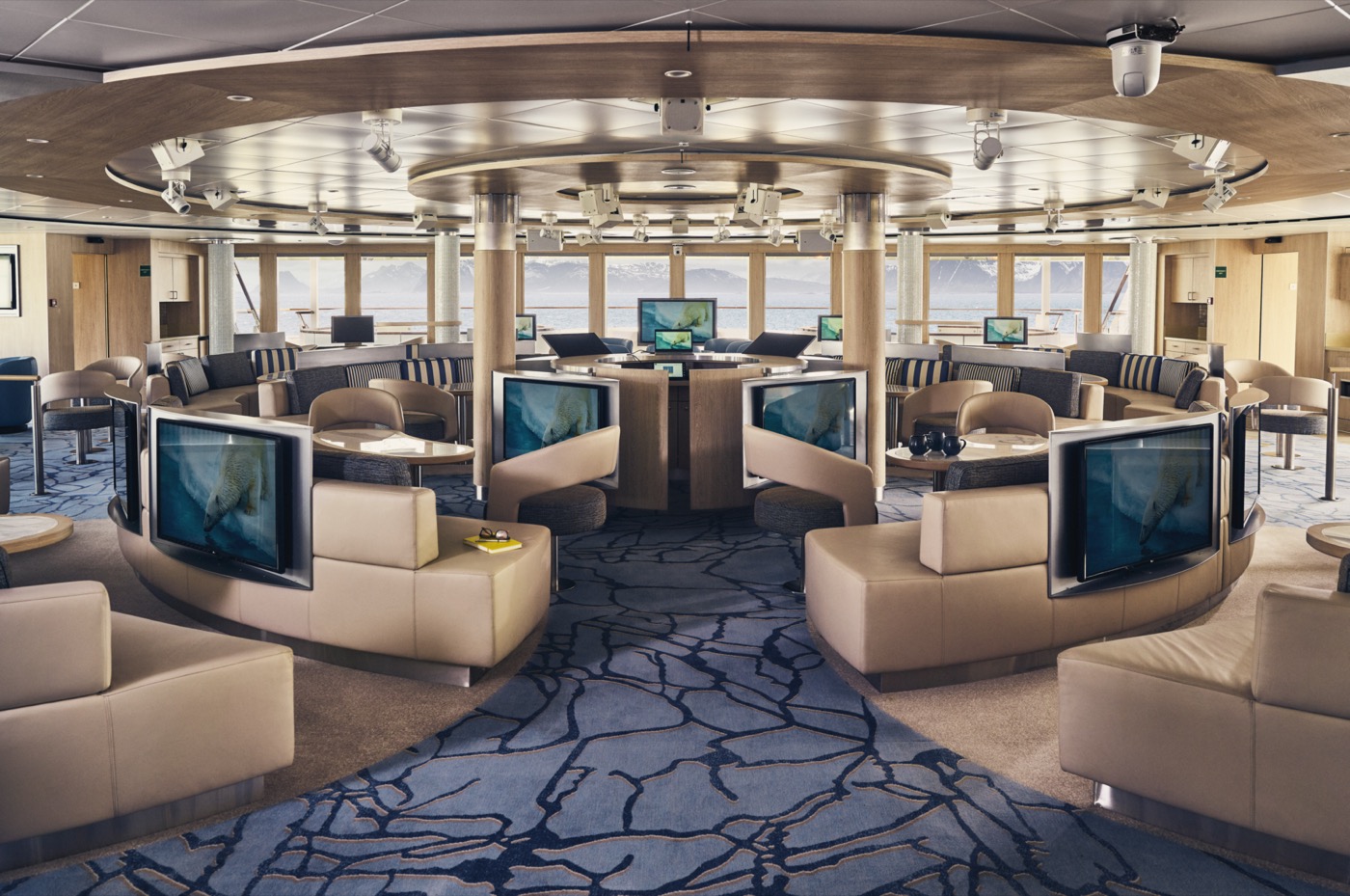 The Lounge Deck’s Ice Lounge, with its signature Lindblad Circle of Truth at the center, is where the daily ritual of Recap—convening, sharing knowledge, and anticipating tomorrow—takes place over cocktails and canapes, with engaging presentations or undersea videos lighting the screens. It’s also home to the Photo Studio, where all guests can rent B&H gear, with our compliments.