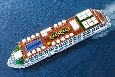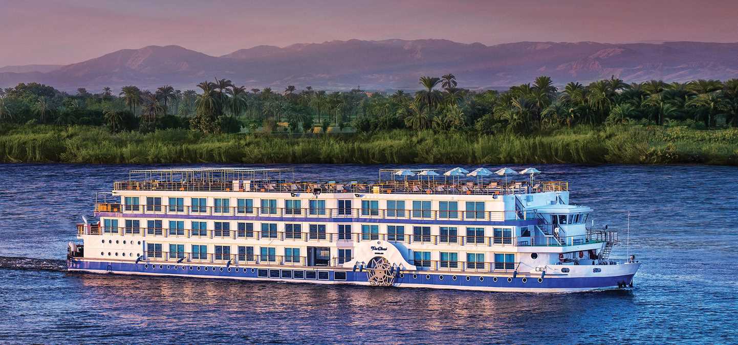 Built in 1996, she was extensively reconfigured in 2015 with just 22 cabins and luxurious amenities, including an Oberoi spa. Windows are nearly floor to ceiling and slide open, offering a connection with the river. The topmost deck has a swimming pool that is the largest of any Nile ship and an alfresco restaurant. Downstairs, there’s a stylish enclosed restaurant serving local specialties as well as more continental options.