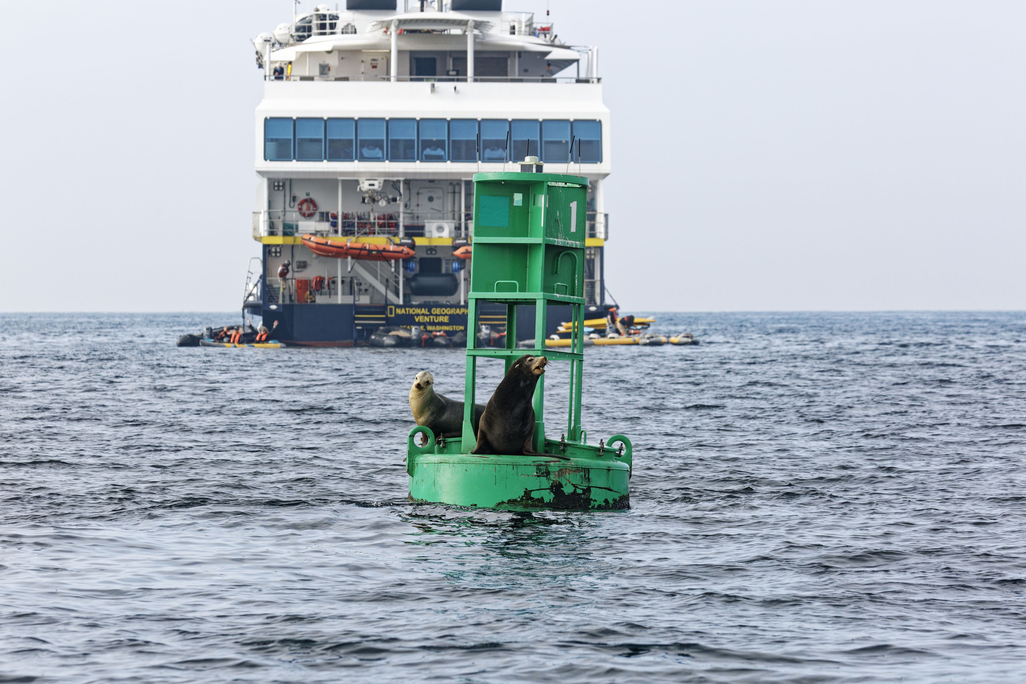 We spent a quiet night sailing down the Brunswick Peninsula. Those who woke early were treated to a beautiful sunrise in Keats Fjord. The conditions were so peaceful after the strong winds departing from Punta Arenas that many of the black-browed albatross were sitting on the water. We also saw southern fulmars, Magellanic penguins, and much excitement over a single blue petrel, which is not so common in these inland waters. We slowly proceeded deep into Agostini Fjord while enjoying our first breakfast onboard.