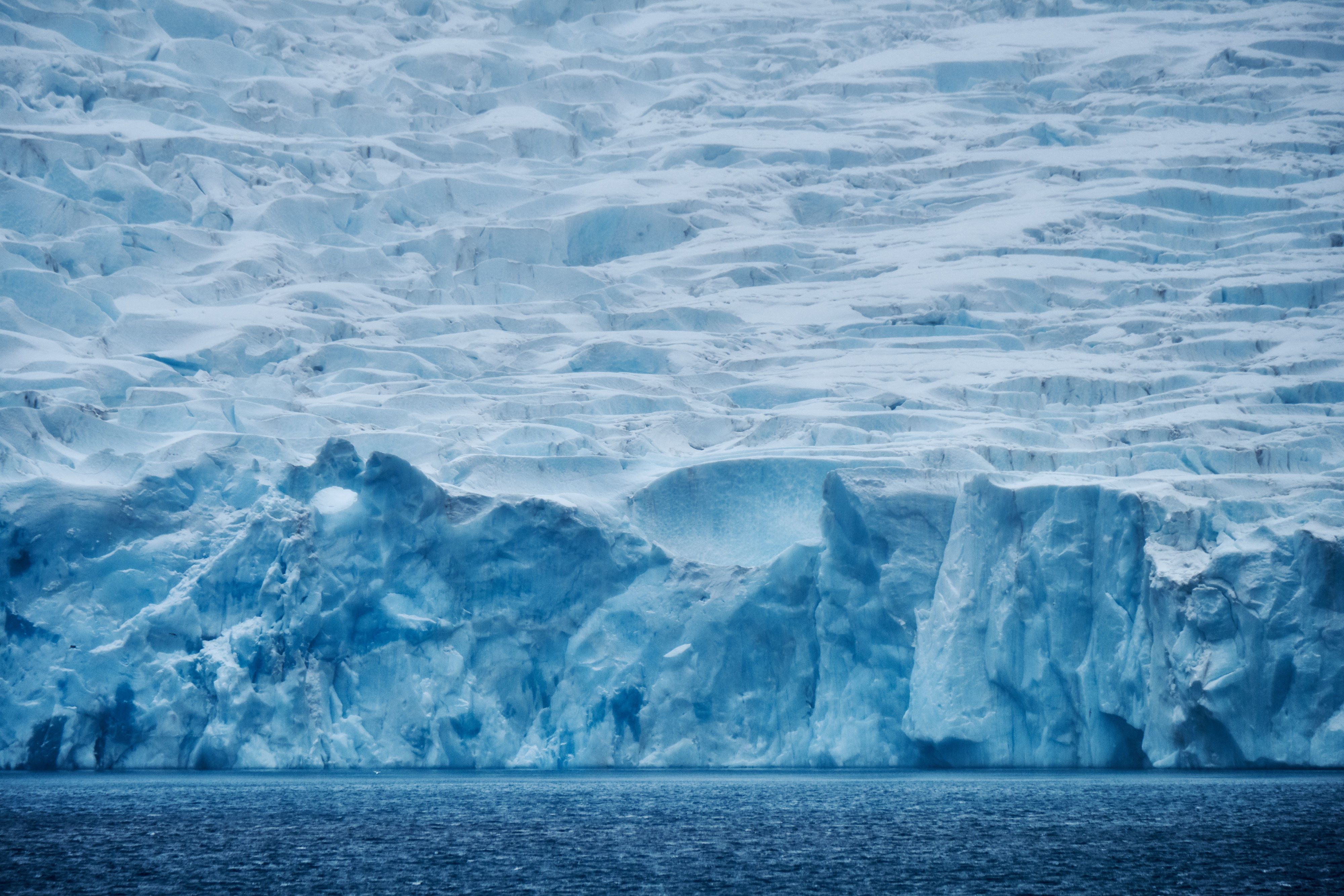 Before lunch, we entered the western end of Seno (Fjord) Agostini and began making our way about 30 nautical miles (50 km) towards the head of the fjord. We could see numerous glaciers along the south side as we sailed deeper into the narrow waterway. Nearby mountains reach more than 3,300 feet (1,000 meters) on south side, and more than 6,600 feet (2,000 meters) on the north side. Our ship reached the head of Agostini Fjord, where we found the terminal end, or tongue, of an impressive terrestrial glacier. This active glacier showed a lot of beautiful deep blue colors within the crevasses near the shoreline. It is obvious that in the recent past, this was a tide water glacier, but now the ice face breaks off mostly along the shoreline. While the ship drifted (the water in this fjord is too deep for us to anchor), most of us went out on a Zodiac excursion to get close-up views of the floating brash ice and bergy bits and watch a continuous process of glacial calving in one area of the glacial face. An unexpected highlight of the excursion was the arrival of a large leopard seal swimming sleekly around the chunks of ice and occasionally approaching various Zodiacs for a closer look. We also admired the exposed shoreline walls of convoluted metamorphosed rock, with complex quartz intrusions crisscrossing throughout. There were numerous water cascades and water falls pouring down from the melting snow banks, and of course, rain runoff. It was no less scenic and impressive when we made our way out of Agostini Fjord, especially when we poked into a side fjord along the way.