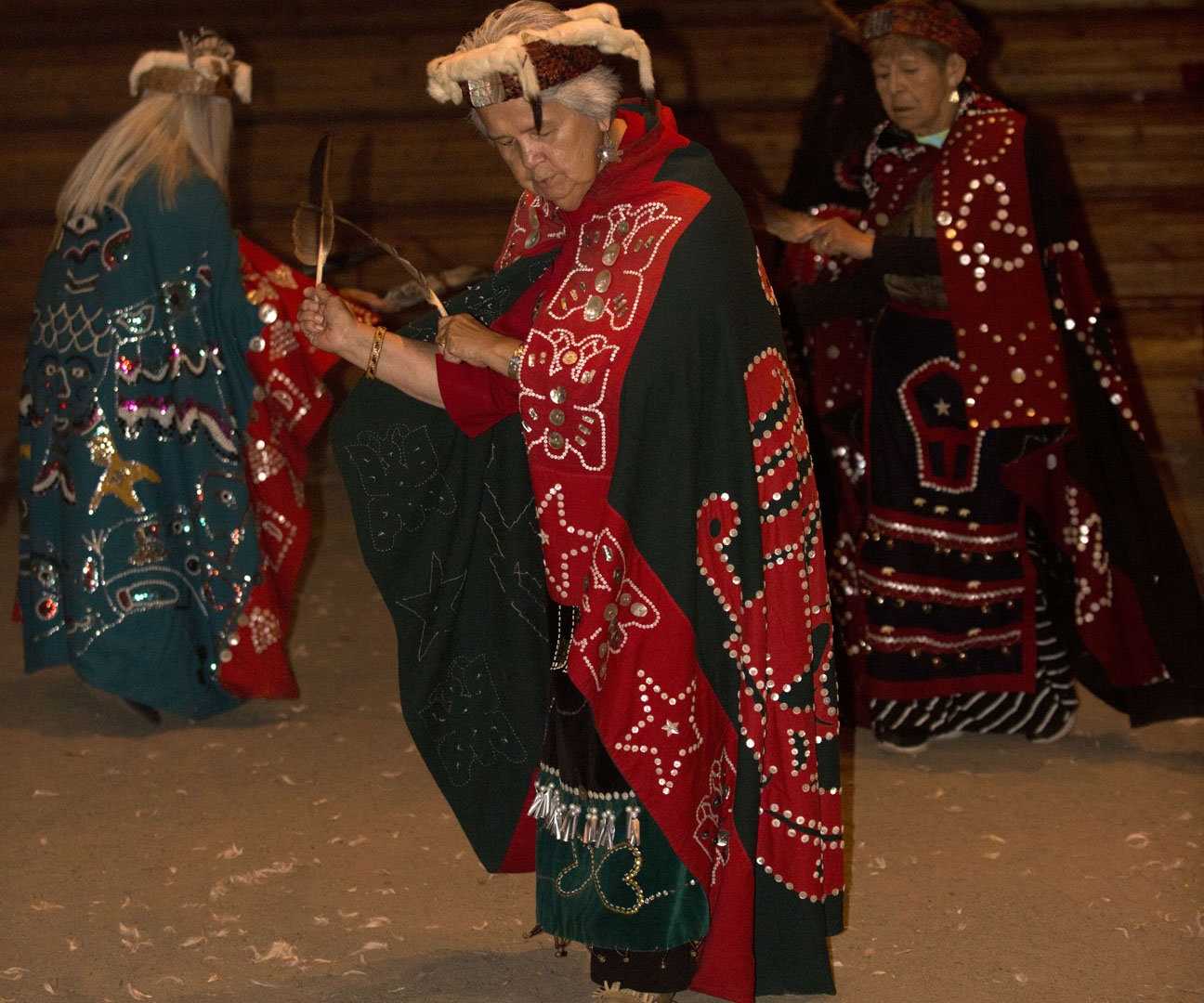 Arriving at the Government Dock in the center of the town of Alert Bay at approximately 8:30 am we prepared for a wet day. The Captain and crew of the Sea Lion finished all preparations for a morning stay dockside. We disembarked and traveled a short distance to the U’mista Cultural Center where we were welcomed by the Namgis people of the Kwakwaka’wakw Nation. This extraordinary museum was opened in 1980 and houses one of the finest collections of elaborately carved masks and regalia used in the Kwakwaka’wakw potlatch ceremony. These pieces were confiscated by the Canadian government in 1921 from a potlatch, held on nearby Village Island. The First Nations community of Alert Bay never forgot the loss of this valuable regalia and in the 1960’s began petitioning the Canadian Government in Ottawa for the return of their potlatch regalia. The Canadian government stipulated a condition of the return of all items - the building of a museum to house them. Among the Kwakwaka’wakw a ransom can be paid for the return of items or captives taken in a raid. In Kwak’wala the word for payment of ransom of returned items is U’mista. Hence the U’mista Cultural Center was built and named, and very often called, with great affection by elders in the community, “our box of treasures.” Through the hallways we wandered, guided by Trevor, who is well versed in Potlatch tradition and regalia. After taking time to see as much as we could in the many rooms we dressed again in rain gear and began a shorter journey slightly west to the gukwdzi or Big House. As we approached we could see the smoke coming out of the smoke hole in the top of the house…a large and lovely warm fire was set and as we entered into the Big House world we were welcomed once again; this time by the T’masala Cultural Group. A tradition among many of the Northwest Coast people is a practice called cultural sharing. As soon as everyone was comfortably seated on wooden benches, elder Vera Newman came forward to welcome us all into a world of ceremony and tradition going back many generations to the mythic age when all human beings, supernatural creatures, shape shifters and beings of the natural world spoke to each other…in balance.