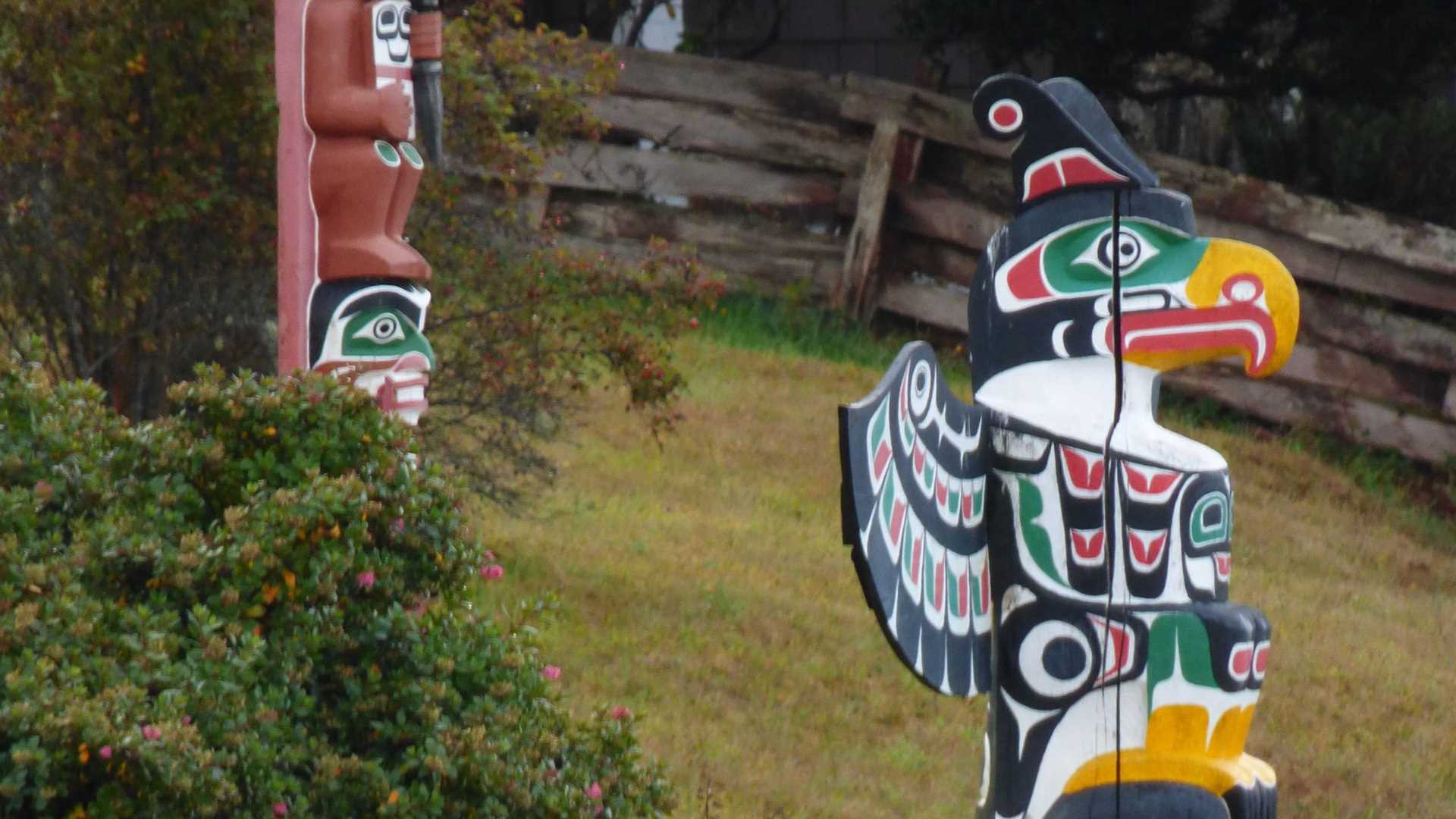 We woke to an overcast, blue-tinted morning with a lone humpback whale feeding near National Geographic Quest’s bow. Flocks of surf scoters flew passed the vessel while low-lying, wispy clouds hung in the mountains surrounding Cormorant Island. The clouds parted with a shining sun soon after docking at Alert Bay and we visited a cemetery with colorful memorial totems for prominent First Nations chiefs and matriarchal leaders. We had a pleasant walk along the bayfront seeing bald eagles resting on pilings, and great blue herons wading on the shoreline as we stretched our legs on our way to the U’mista Cultural Center.