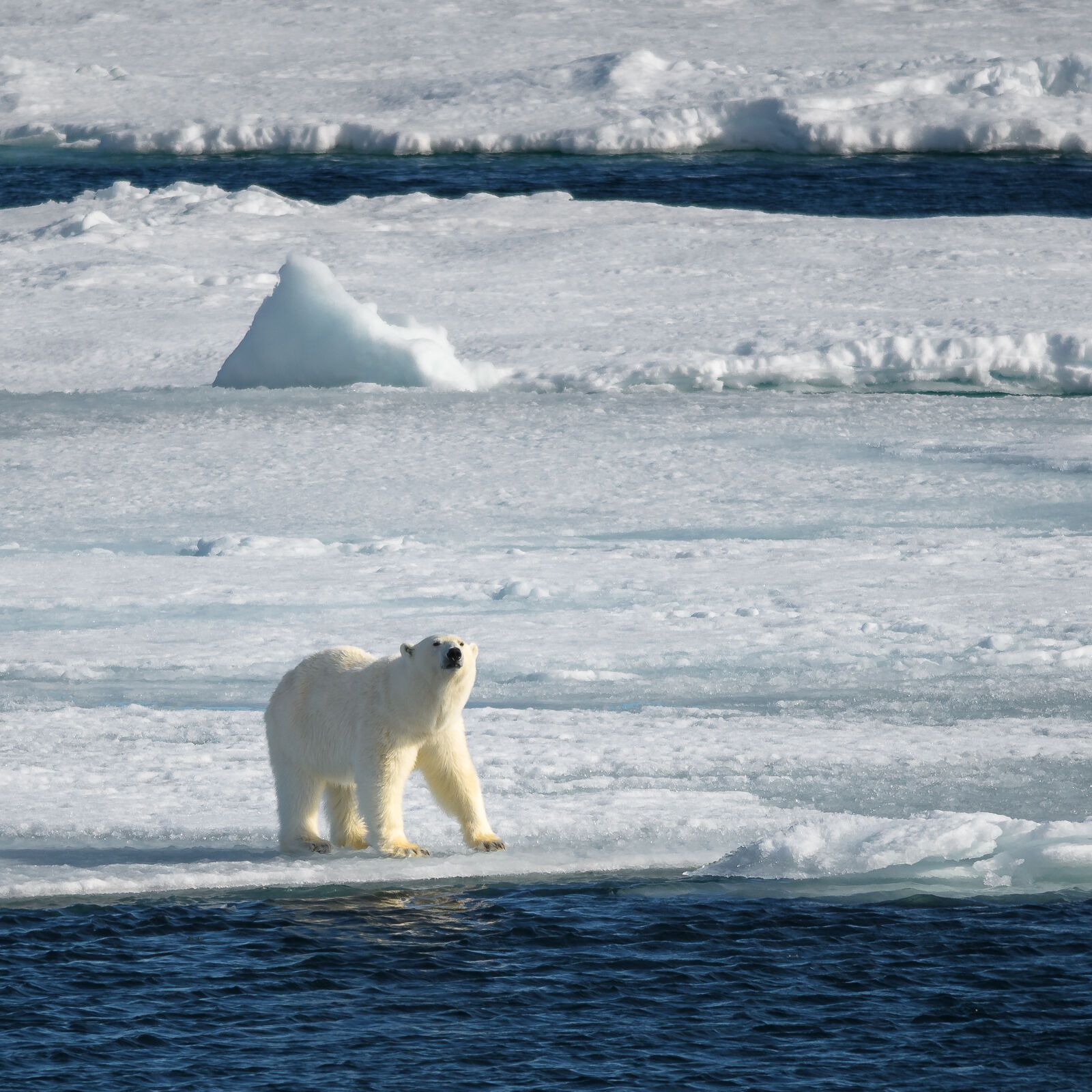 With favorable weather and a promising sea ice forecast, our expedition leader and captain planned for us to press north so that we will ultimately be the first vessel of the season to successfully transit the entire coast of Eastern Spitsbergen, rounding the top of the island to the west, and back into the ice-free waters of Western Spitsbergen. The time spent accomplishing this will not be idle by any stretch. We spend a significant amount of time scanning the waters of Svalbard for wildlife. In particular, we are looking for the Great White Wanderer, Isbjorn, Nanuk…the polar bear. The efforts of our quest paid off shortly before dinner. Just as evening recap was underway, a call from the bridge alerted us to the presence of three bears–a female and her two yearling cubs–traveling over the dense sea ice. We watched them make their way from floe to floe. With her well-fed cubs in tow, the mother chose the route, smelled the air, and marched on with purpose.