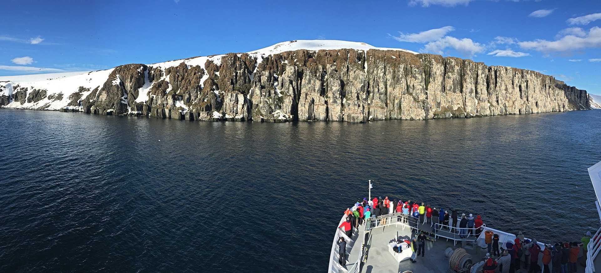 We hardly had time to catch our breath from our adventures up in the ice north of Svalbard when we received the early morning wake up call. We were told that the day was sunny and that the ship was close to Alkefjellet, the impressive bird cliffs on the northeastern coast of the island of Spitsbergen along the coast of Hinlopen Strait.