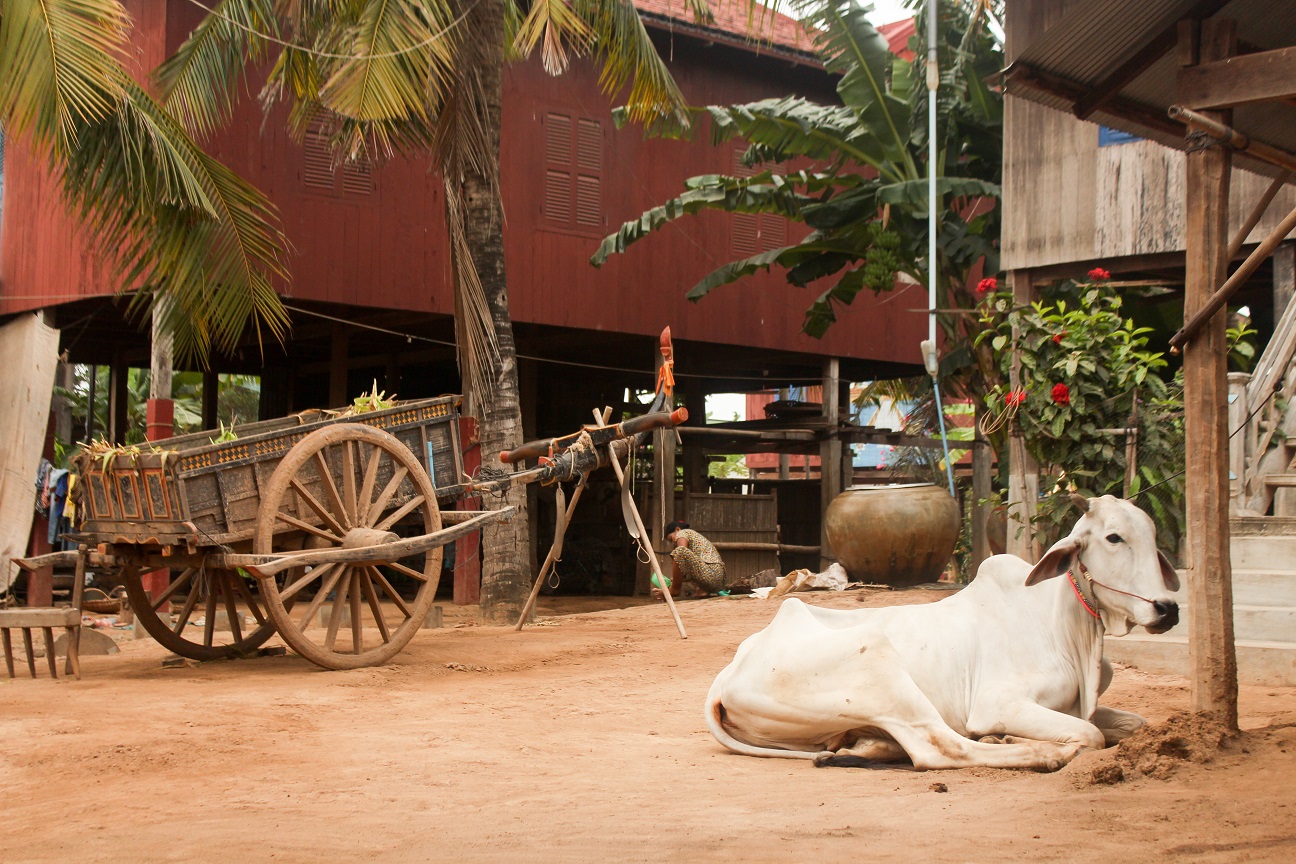 Today we awoke to an unexpected sight, a thick blanket of fog laid across the river which restricted visibility to around 100 feet. As the sun came up this started to clear but we were fortunate that the morning was largely overcast and (relatively) cool. A multitude of barn swallows is buzzing around Jahan as they are feasting on the swarm of flying insects which are attracted to the ship’s lights overnight. After our own hearty breakfast, we headed to shore. Our morning excursion took us to the small village of Angkor Ban, situated on the banks of the Mekong in Kampong Cham province. Kampong Cham is one of the wealthier and more developed parts of Cambodia, but Angkor Ban remains relatively undeveloped. They only had electricity connected in the last decade. Winding our way around houses and farming equipment, through laneways and backyards, we encounter all manner of domesticated animals. A village elder even lets us check out their stilt house.