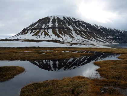 Overnight we have sailed southward from the great ice face of Negribreen through Storfjorden, the “broad fjord.” As we approach Ärdalsnulten on southwesternmost Edgeøya, the water is steely-grey and small waves are reflecting the soft Arctic light. Edgeøya is named for the Englishman Thomas Edge who sailed here in 1616. Rising from the cold shore are ice-planed mountains formed of sedimentary rocks and rasped down to the same heights by glaciers; low broken clouds lie just above the mountains. Steep slopes plunge seaward, vertically eroded and corrugated with their grooves snow-filled. Through the horizontally layered sedimentary rocks a dark sill of doleritic rock runs like the filling in a sandwich. The sill formed as magma forced its way in between layers of older rocks and now, being harder than the sedimentary rocks, it stands out in relief on the slopes.