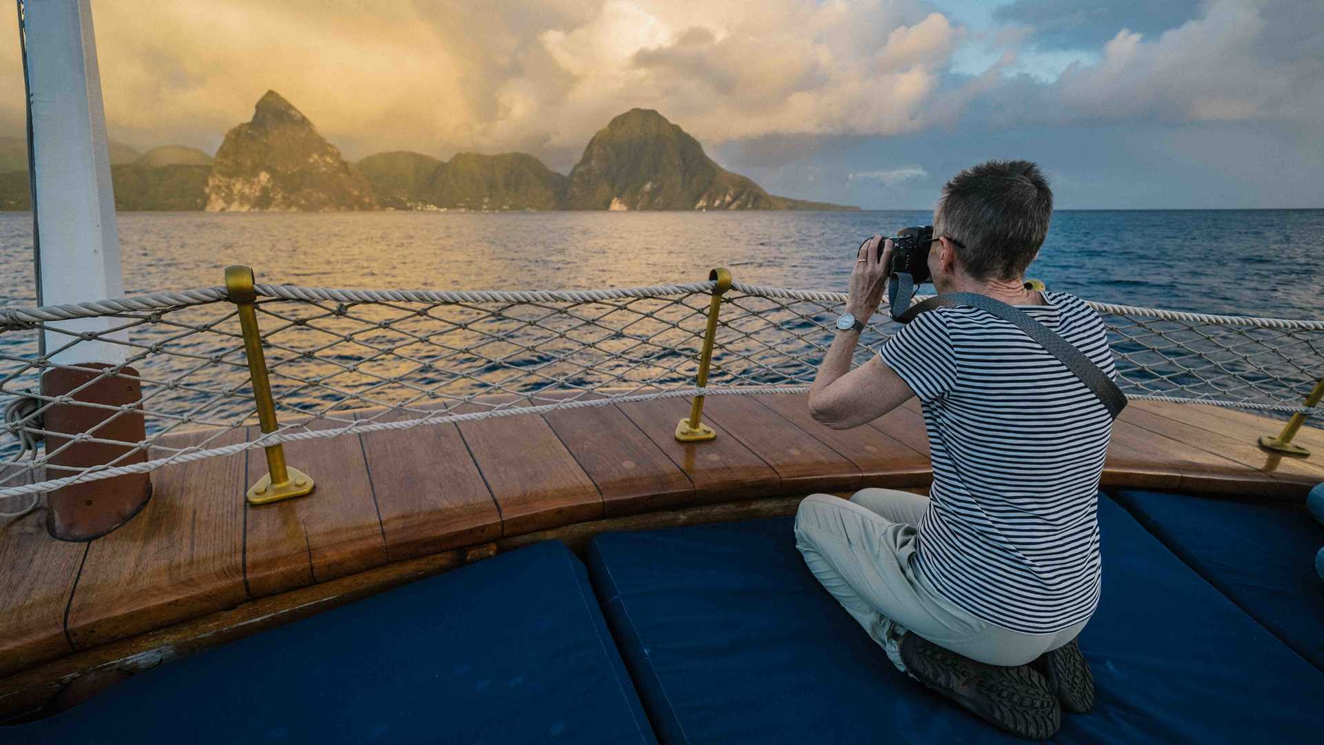 We sailed by the UNESCO World Heritage site of Gros and Petit Piton (meaning “large and small peaks”) a little before 5 p.m.–spectacular against the azure sky and deep blue sea. Simon, our hotel manager, provided local piton beer and flaky cheese rolls.