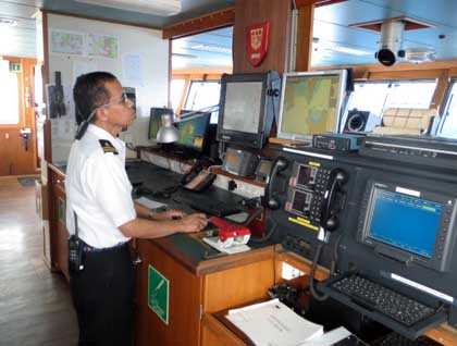 By suppertime we had entered the broad mouth of the north entrance of the Amazon River Delta. It was tricky navigating through the channels in this broad, featureless braided river system and our navigation officer remained diligent, using both paper charts and electronic charts displayed on monitors (see photo). From here we continued slowly up stream toward the city of Macapa, where we planned for a morning arrival and clearance into the country of Brazil.