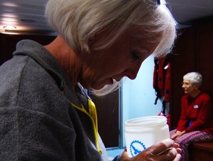 There’s no shortage of interesting topics to explore on this voyage, and today’s schedule provided opportunities in geology, history, photography, and marine science. From the formation of the South American continent and Andes mountains to the early life and adventures of Charles Darwin, we’re busy listening, posing questions, and appreciating engaging conversations. Lessons in image editing opened the afternoon, following which a small team of researchers sampled the surface marine environment. They assessed the temperature, salinity, pH, water clarity, and plankton community at the eastern edge of waters that comprise a mix of River Plate freshwater and Argentinian continental shelf seawater; as the trip progresses, we’ll compare the observed conditions with those at other locations.
