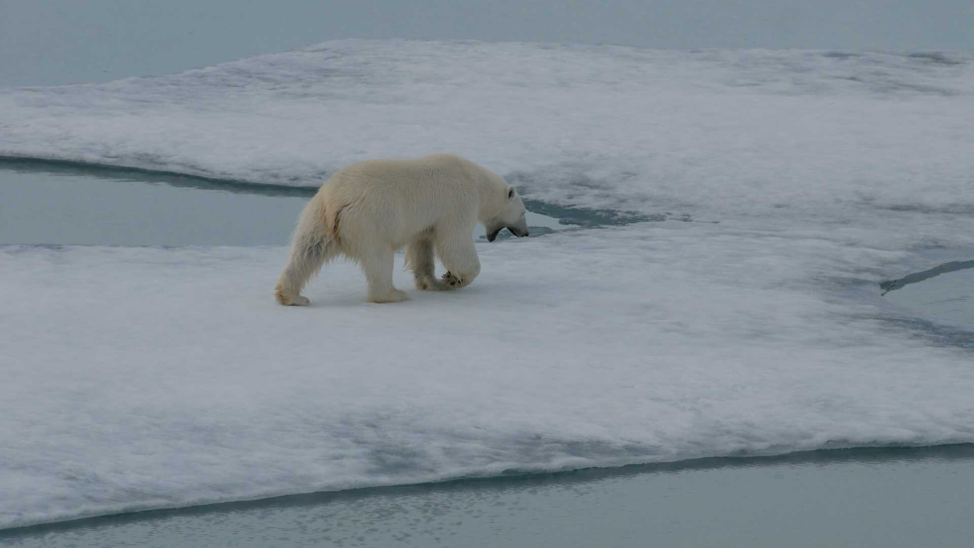 We could see these bears with our naked eyes. Around noon, a young adult male, roughly six or seven years old, cautiously approached the ship. He showed all the signs of a bear who is curious about the ship and its strange smells, but he was a bit anxious and wary, too. He kept yawning and sticking out his tongue, and his ears were laid back instead of forward. After posing for a quick photo shoot, he soon headed back across the ice to observe from a more comfortable distance as we continued on our way.