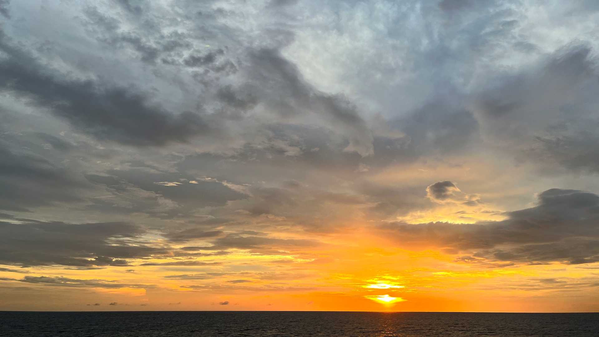 The sunset was as peaceful as the sunrise. A giant orange orb sunk below the horizon over calm seas amid a few wispy clouds.