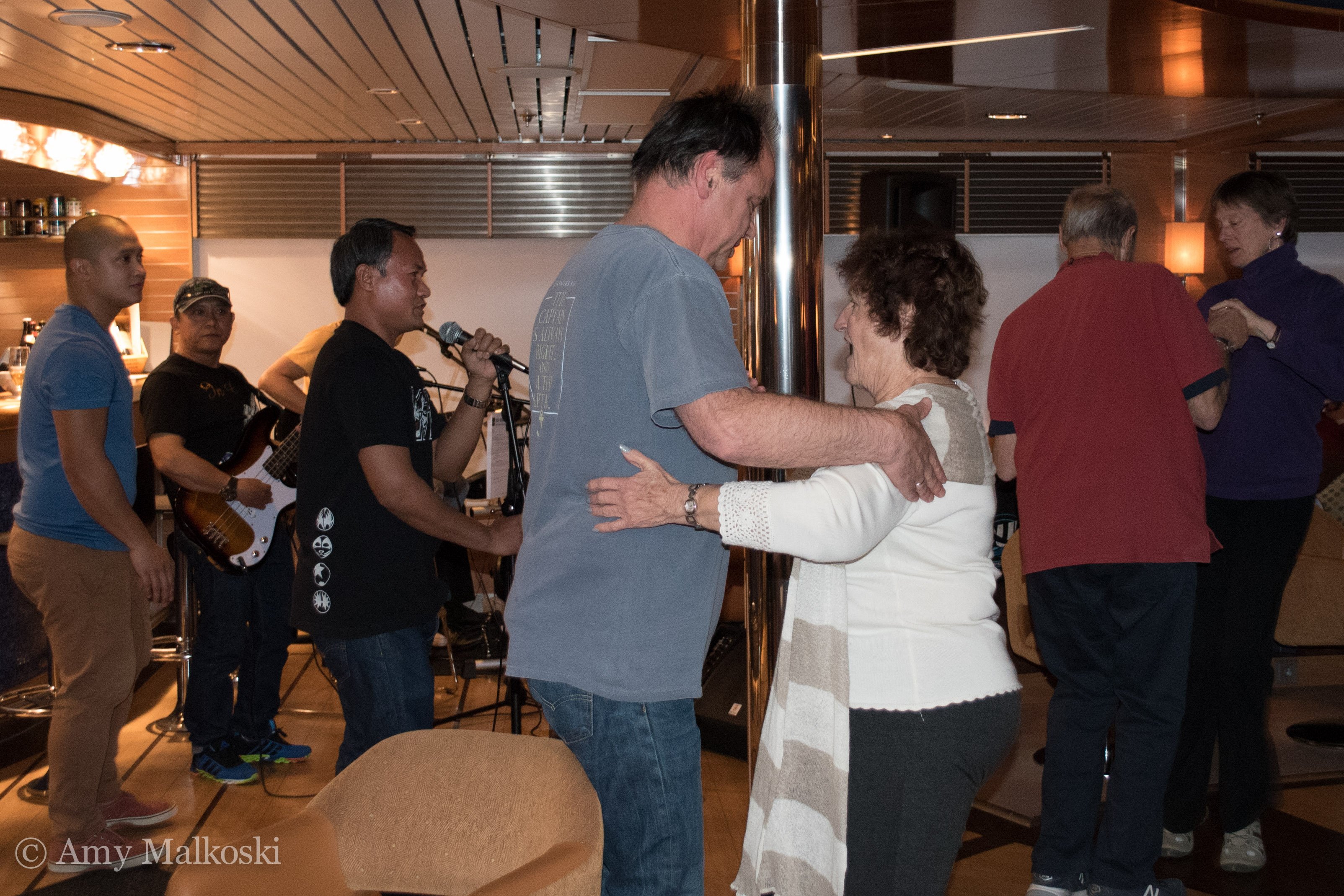 Shortly before recap we began to see the geography of Iceland off the port side of the ship and have officially left the Arctic Circle! We sailed into one of Iceland’s fjords, a sheltered area, to anchor for the night. During tonight’s recap we saw a superb preview from the video chronicler of the voyage and after dinner we enjoyed a performance by the crew band, the “Spice Boys”. We danced until the sun went down, experiencing our first sunset in two weeks.