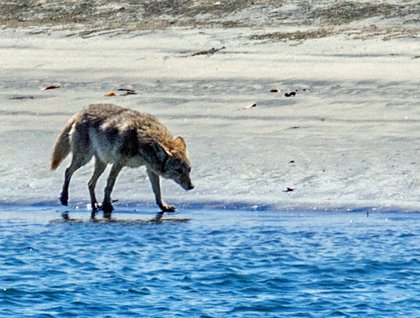 A mile or so past the picturesque Mexican fishing town of Pto. A. Lopez Mateos, we dropped our anchor near the tip of the island and went ashore to walk the beach and play in the dunes. The stunning sand beach that lead us back out toward the Pacific Ocean breakers is littered with a colorful profusion of shells and populated by crabs and shorebirds, while the dunes are home to coyotes, jackrabbits, and nocturnal desert mice. Mangrove skeletons scattered across the beach left stories of typhoons and added a sculptural dimension, while the presence of magnetite in the sand painted some glittering blue black streaks on the wild scene.