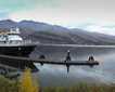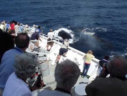 As hoped for, we encountered many humpback whales this afternoon. This included individual adult whales, mothers and calves, and a few trios of animals including two adults and one calf. Much of the afternoon was spent watching whales. Actually, the whales must have found us a curiosity, because they were watching us as well, and approached the ship several times to have a closer look. In the accompanying photograph, one can see three whales (two adults and a calf) right next to the ship. They purposely swam over to the ship and then cruised alongside our vessel, spraying the guests on starboard side with their blows. People were cheering and yelling to the whales as they looked up at us. It was awesome! Many more whales were sighted during the remainder of the day, but we needed to keep on track in order to reach our pilot station in good time in a couple days in Rio de Janeiro.