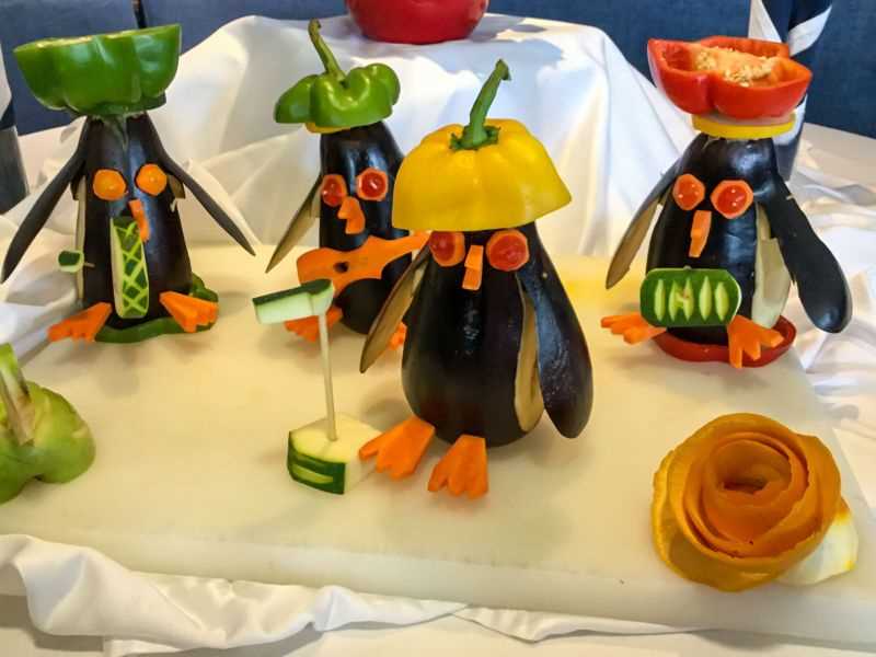 We hope soon to encounter Magellanic penguins. Curiously, dictionaries often give the etymology of penguin as coming from the Welsh pen, meaning head, and gwyn, meaning white, an inexplicable derivation in multiple ways, not least because penguins have black heads. It seems that it was Francis Drake who first made this suggestion in his account of his voyage of circumnavigation on board Golden Hind in the reign of Queen Elizabeth I in order to give the British a prior claim to the Americas over Spain and Portugal. He wanted it put about that the Welsh, the original British, had discovered the New World at an earlier date and that evidence for this existed in native vocabularies. A vegetable carving demonstration in the lounge this morning got us into penguin mood.