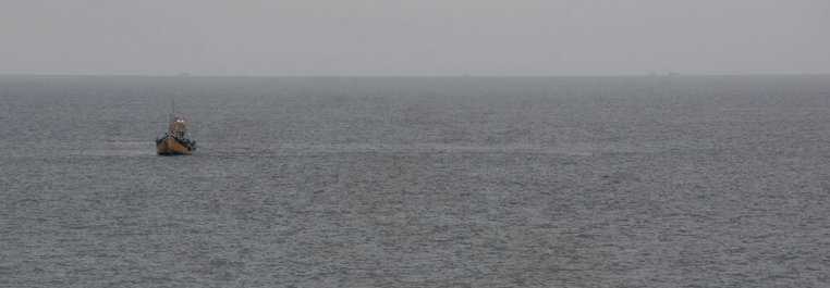 Before breakfast, everything was even quieter than usual, with only a few dolphins playing in the bow wave, far less than usual, and very few flying fish scattering in front of the ship. Our eyes could glide on the horizon line all the way to the clouds in the distance, only interrupted by the silhouette of ships here and there, some of them cargo carriers, but most of them much smaller fishing boats.