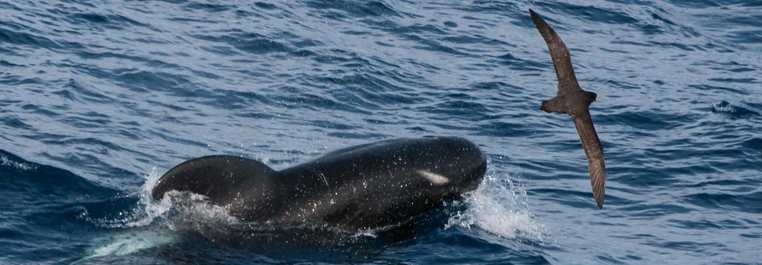 Long-finned pilot whales are deep divers.  In the dark waters, deep below the surface, below the light, they hunt for squid and fish, perhaps with the help of their large melon head and echolocation.  And these pilot whales were not alone.  When we have seen long-finned pilot whales at these latitudes we have sometimes seen the beautiful hourglass dolphin accompanying them, a boldly patterned species with an elongated hourglass of white against the black on their sides.  It’s hard to describe their beauty, you must see them.  The hourglass dolphin is a pen and ink drawing by a master artist. They too feed on fish and squid, but their association or cooperation with the pilot whales is a story of few details at present.  The hourglass dolphins have not been well studied, as they occur off shore between about 45 and 60 degrees south latitude where the ocean runs cold, wild and circles the world.
