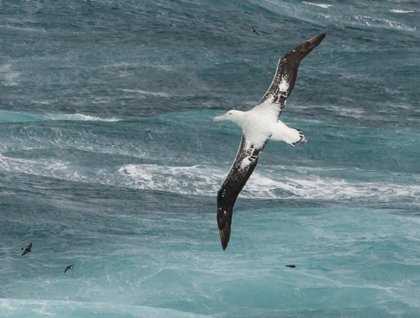 As the National Geographic Explorer continued her push toward South Georgia, all onboard were pleasantly surprised and relieved by the smooth and gentle motion created by the following seas and wind. Early-risers who went to the bridge were treated to great views of a wide variety of Southern Ocean seabirds. By breakfast time we had seen eleven species, from the largest albatross to the smallest storm petrel, including the favorite of many bird enthusiasts, a most graceful aerialist, the Light-mantled Albatross.