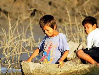 The expedition continued today with a skiff ride exploration of an oxbow lake known as Atun Poza. We even had the chance to meet a local fisherman who gently showed us the first catch of the day. The icing of the cake was, for many of our guests, the experience to have breakfast outdoors aboard the skiffs! We had our first meal of the day served in the most fashionable way, white gloves on our bartender’s hands, fabric napkins in our laps, and even handicraft dolls holding the napkins were included. As a background we had the green surroundings and a concert of tropical sounds as companions all while being covered with the rain forest. On our return trip we paid a short visit to the small village that holds the same name as the lake, Atun Poza Village. As the whole area is in very shallow waters at this time of the year, many villagers were involved in fishing activities.