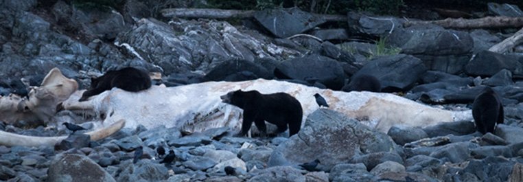 On we sailed and still in the morning darkness we were able to see the remains of a large female humpback whale on the beach. Large pieces of the animal were still visible – white, mostly blubber, which seven (repeat, seven) bears were feasting upon. They were accompanied by a good number of ravens, enjoying the same feast, always trying to get out of the way of a large brown bear changing places. A group of this size can feed on a massive amount of food, and partially forego strong aggression: very few fighting bouts were observed. These were all brown bears, also called grizzly bears in the highlands of Canada and the lower forty-eight.