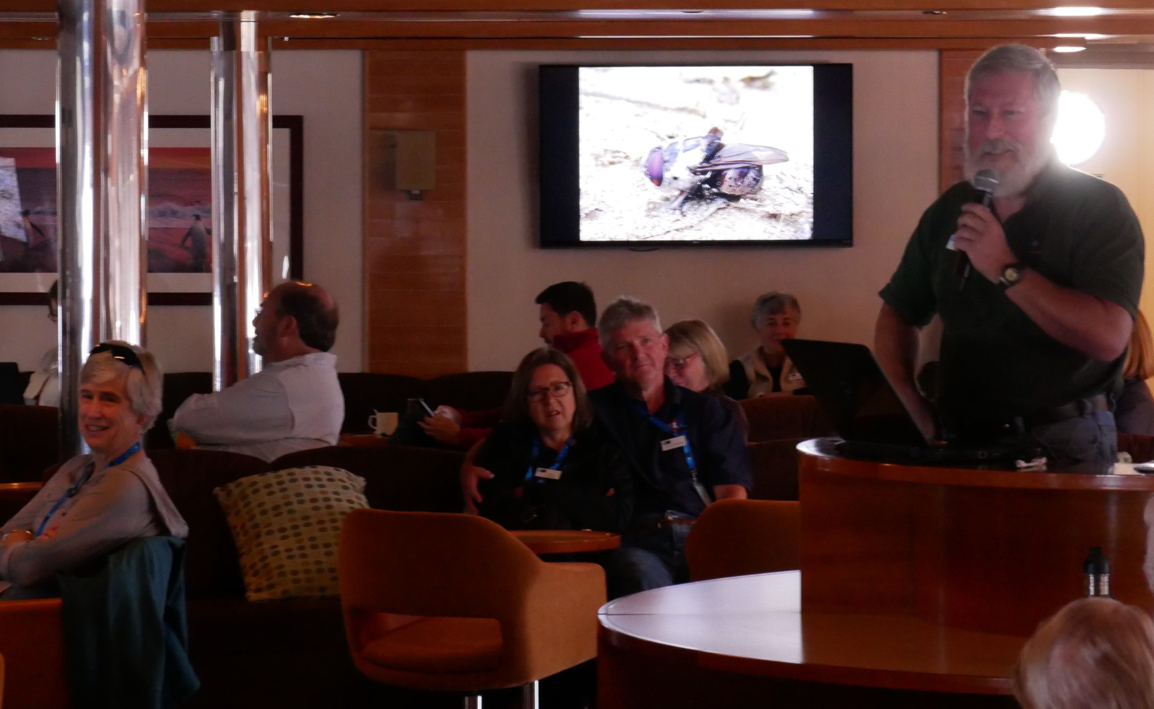 In the main lounge, as views of icebergs appeared and disappeared out the windows, we settled in for a day of intellectual stimulation through talks and lectures from our specialists onboard. The first presentation was by Global Perspectives guest speaker Bob Bindschadler, a renowned NASA scientist who has studied Antarctic glaciers for decades. Bob’s talk, called “Earth’s Bi-polar Disorder,” used the glacier story to make an ironclad case for the reality of climate change. Guests who heard the talk used superlatives to describe the clarity and the impact of the presentation.