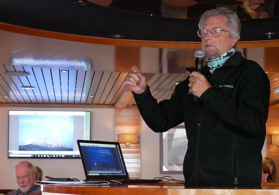 After bidding farewell to Greenland yesterday we struck out across the famous Baffin Bay, named for William Baffin, the 17th century explorer who set out in search of the Northwest Passage for England. Motoring at a steady pace, we filled the day with bird-watching and informative lectures about many different aspects of the Arctic. The fog came and went and every once in a while, a huge iceberg would quietly float by.