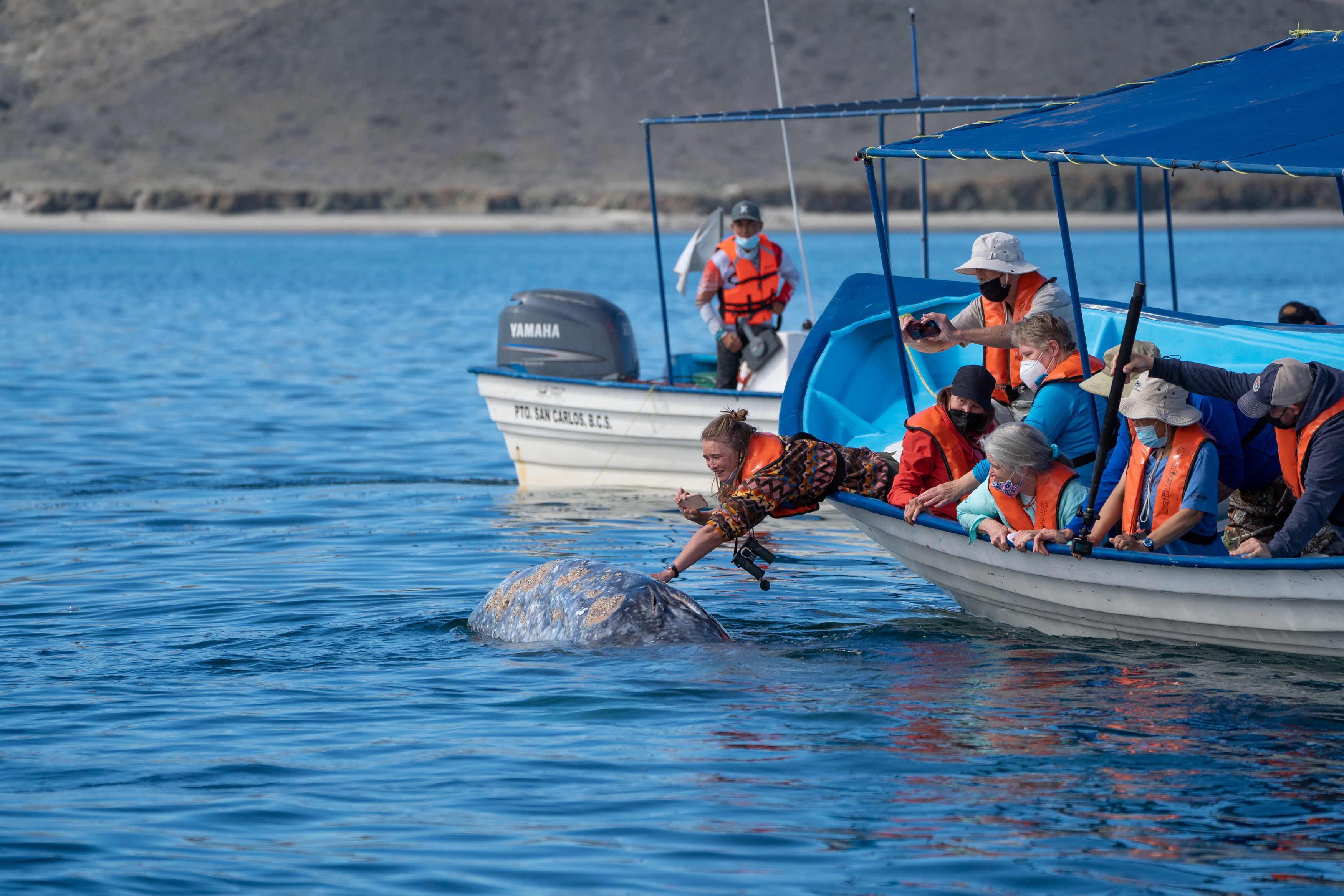 Today, we woke to an absolutely incredible sunrise as we anchored at Isla Santa Margarita. After breakfast, we boarded pangas and rode to Bahia Almejas with the sun shining on our smiling faces. It was not long before we saw the telltale heart-shaped blows of gray whales. Whales quickly surrounded us on all sides, showing off for one another. We were in a mating area, so it was common to see spyhopping, breaching, and breathtaking clusters of whales. We were treated to a friendly visitor today, as one whale came right over to us. The whale spent about 45 minutes with us, allowing guests in each panga to pet its face. This is such a rare treat, one burned in our memories forever. As this close encounter with such a gentle animal unfolded, shouts of joy were heard.