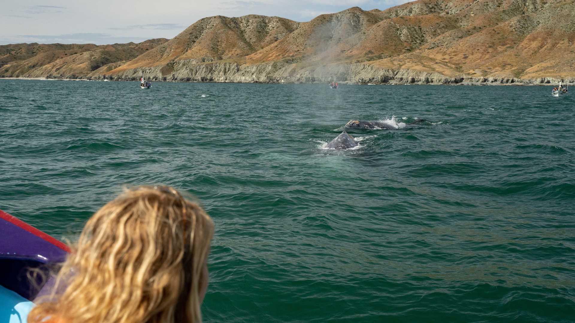 By 10:00 a.m., the pangas that had departed National Geographic Venture for Bahia Almejas were in the middle of cetacean soup. Gray whales were spouting in every direction, and spyhopping like 40,000 pound versions of Whack-A-Mole. Our little boat – just over half the length of a fully-grown adult gray – rocked in the waves as whales surfaced and dove around us, and at one point we were lovingly nudged by a whale directly beneath our hull. The baptisms by whale breath were a bonus. Given the amount of post-Valentine’s Day courtship that was taking place among the giants, eau du gray sneeze could fare well as a very eccentric perfume.