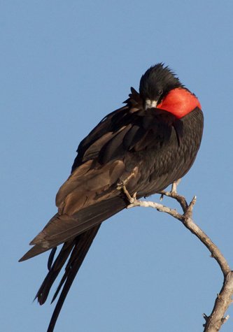 We had expected fog this morning for our early whale watches but instead, we had a glorious sunrise under crystal clear skies. On the way out to see the whales we passed by the roosting area for magnificent frigatebirds and caught a picture of a male with his red gular pouch partly inflated in the yellow-orange early light. The males inflate their pouch during breeding time to attract the females who fly overhead with a critical eye. Whoever has the best pouch wins the damsel.