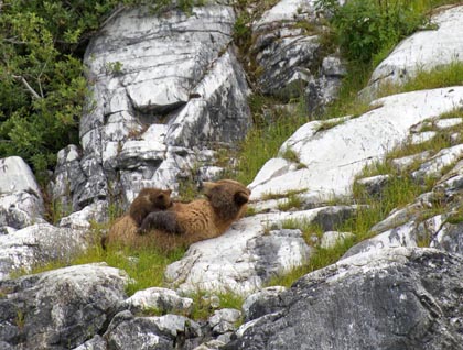 Lake Eva became our afternoon playground. Kayaking and a variety of walks kept us busy, but the lovely brown bear walking the edge of the back lagoon kept us enthralled. As kayakers admired the lovely falls created by the stream from Lake Eva, a brown bear was spotted. This bear could not have been more cooperative for viewing as it skirted the shoreline, crossed the lagoon in the shallows, came up the trail where one hiking group was admiring it, crossed back to the shoreline, swam across the lagoon, and then continued along the edge of the forest, eating blueberries from the bushes as it finished its clockwise circuit of the inner lagoon. Kayakers just spun in little kayak donut circles to watch the whole show.