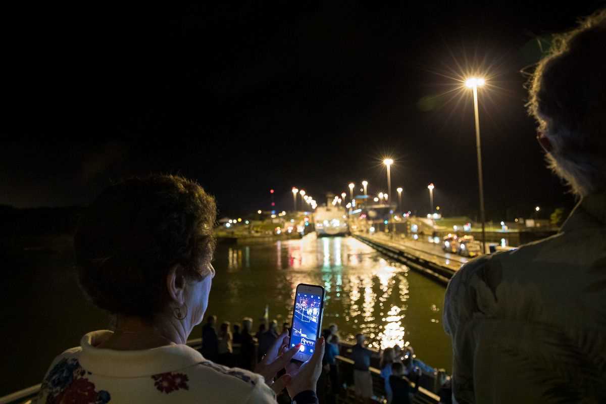 We began our adventure last night when we got on board National Geographic Quest, and almost immediately the Panama Canal Pilot repositioned our vessel from the port in Colon to the entrance of the Caribbean set of locks, the Gatun Locks. Three chambers filled with 52 million gallons of water lifted us 85 feet into the Gatun Lake. Crossing the canal at twilight hours is a wonderful thing; the lights are dim, the temperature has dropped ten degrees and more movement and workers than during the day.