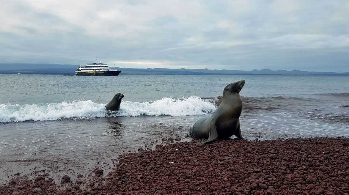 The afternoon was different, we motored not far away to another visitor site called the island of Rabida, which is very red, because it is rich in iron oxide, and in the late afternoon light, glowed as no other island does in Galapagos. We had the kayaks out for our first round of the trip, they went along the coast to have a close encounter with sea lions and sea birds while swimmers and deep-water snorkelers arrived to the red beach of the place to enjoy the Galapagos marine life. It was once again a fantastic experience.