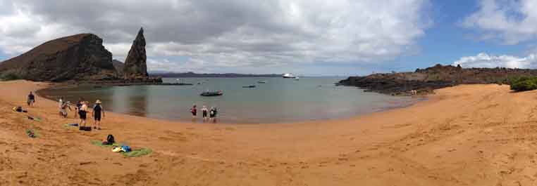 Into the afternoon, our Captain John navigates the ship towards Chinese Hat Island, close to the southeastern coast of Santiago. To the ocean we go once again, snorkeling between Chinese Hat and Santiago islands. Diamond sting rays, gold and blue snappers, black-stripped salemas, and sergeant majors find us floating among them as we continue into the shallows. As we finish a completely satisfying snorkel approximately ten Galapagos penguins actively feeding on small schools of fish envelop our entire group. Penguins do fly, as we see these incredibly fast and agile swimmers pick off small fish, and within a few minutes they are gone, leaving us with smiles and a lack of descriptive words. After a quick dry off at the ship, we are out again for a Zodiac ride as the sun dips into the horizon over Isabela Island. A massive lava flow, just over a hundred years old, comes to the edge of Santiago. If it had continued a few hundred meters more it would have connected Chinese Hat to Santiago. Striated herons calmly walk close to the water’s edge stalking small fish. Marine iguanas are warming themselves upon the black basalt lava flow after their foray into the water to feed. In the distance a Galapagos Hawk hangs approximately 50 meters above the coast searching for unfortunate prey. As we return to our floating home, a few Galapagos penguins get out of the water and start to preen as a golden light falls, and the incredible contrasts move us once again.