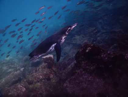 In the afternoon some guests explored by kayak the coastal zone of Rabida Island. Some went deep water snorkeling, while others took walks along a red sand beach. During these outings, a group of playful fur seals joined the snorkelers, while other guests spotted a Galápagos penguin searching for food and a solitary greater flamingo feeing in a brackish water lagoon.