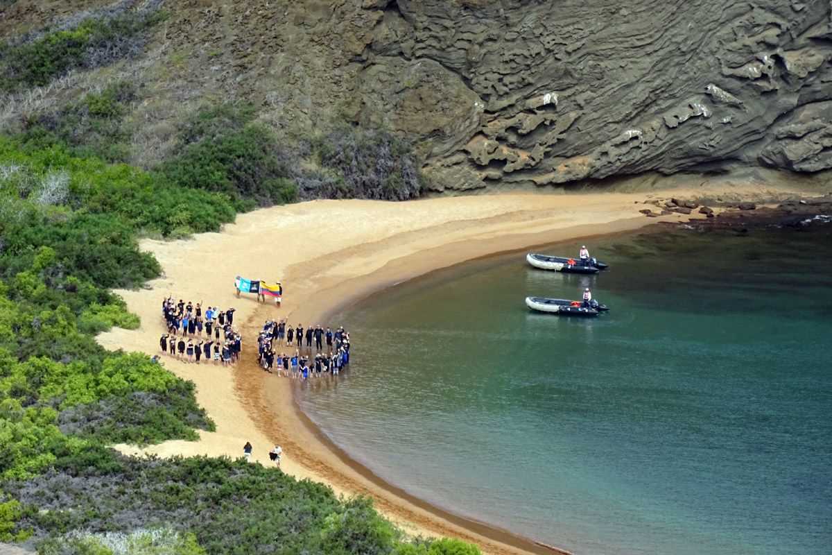 We woke up this morning by the Island of Bartolome, where after walking to the top of the island, we had an amazing photo opportunity of the famous Pinnacle Rock followed by a delicious breakfast. We observed many colorful tropical fish species at the snorkeling site, and had a great time swimming with some Galapagos penguins in their feeding activities. A huge pod of bottle-nosed dolphins gave a fantastic show around the National Geographic Endeavor II before we took off as if they were part of the celebration of 50th anniversary.