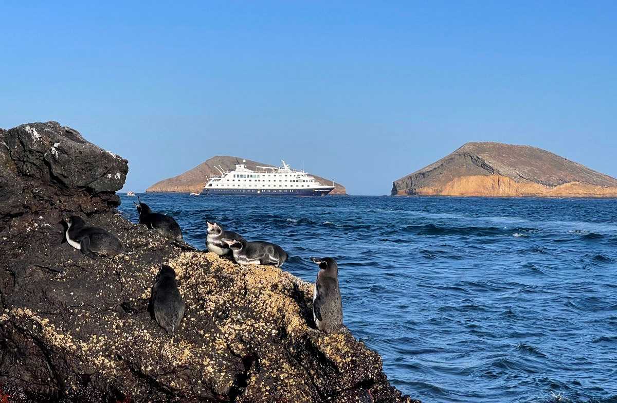 In the afternoon, our guests went snorkeling from the Zodiacs. This was an excellent opportunity to observe the marine life of the Galapagos. After snorkeling, some of our guests went on a Zodiac exploration to observe the coasts of Sombrero Chino and Santiago Island. We spotted some Galapagos penguins resting on the lava rocks. As we got closer, we observed Galapagos sea lions, pelicans, and a couple blue-footed boobies. We returned aboard after this coastal exploration and enjoyed a colorful sunset.